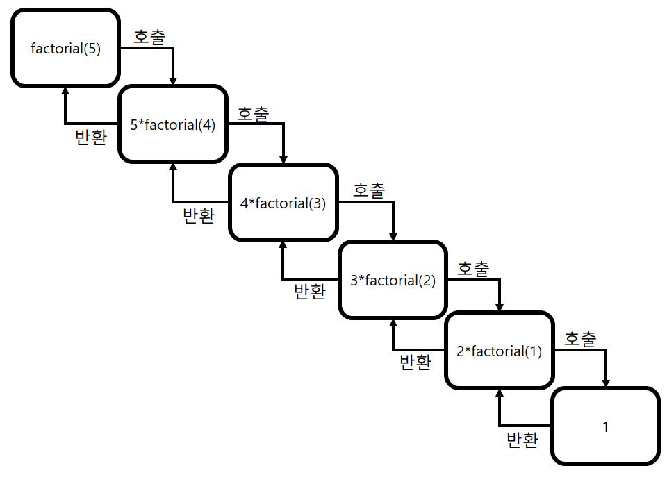 팩토리얼은 자신보다 작은 자연수를 곱하는 연산기호입니다. 5! = 5*4*3*2*1이라는 결과가 나옵니다. 해당 결과를 조금 바꾸어 보면 5! = 5*4!이라는 결과도 나올 수 있습니다. 해당 방식으로 재귀함수를 구현하였고 각각의 결과를 반환하여 120이라는 결과를 도출하였습니다. 해당 형식처럼 재귀함수를 사용하여 반복되는 형식을 계속 사용할 때 쉽게 이용할 수 있습니다.