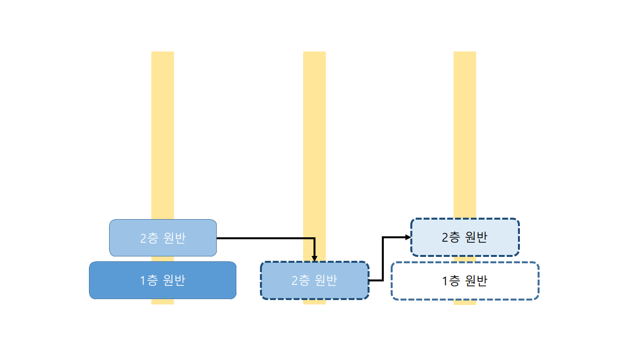 원반이 여러 개가 있는 경우에는 '항상 작은 원반이 위에 있어야 한다.'라는 규칙으로 인하여 보조 기둥을 이용하여야 합니다. 따라서 보조기둥을 이용하여 2층 원반을 두고 1층으로 두어야 합니다.