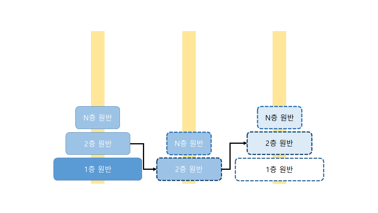 2층 원반을 통하여 알 수 있는 것은 1층 원반을 이동시키기 위해서는 2층 위에 있는 모든 원반이 보조 기둥으로 이동하여야 한다는 점입니다. 그렇게 하면 1층 원반을 이동시킬 수 있습니다. 그리고 2층 원반을 이동시키기 위해서는 또 다른보조 기둥에 3층 위에 있는 모든 원반이 있어야 한다는 점까지 알수 있습니다. 해당 방식을 재귀적으로 해결할 수 있습니다.