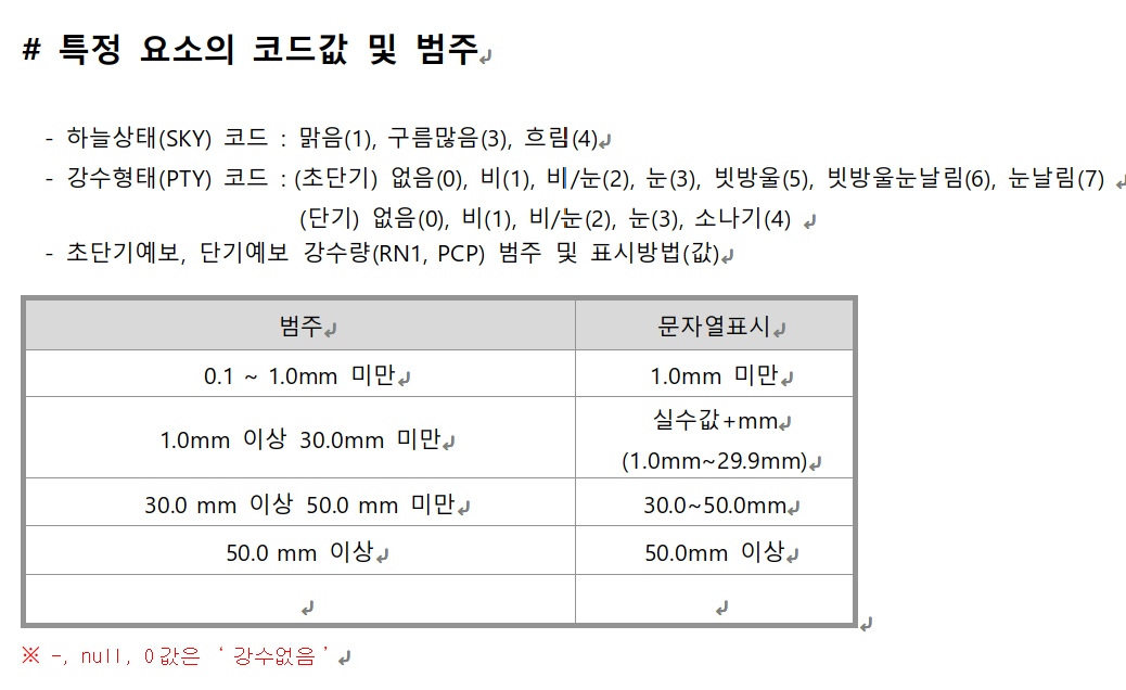 # 강수형태: 없음(0), 비(1), 비/눈(2), 눈(3), 빗방울(5), 빗방울눈날림(6), 눈날림(7)