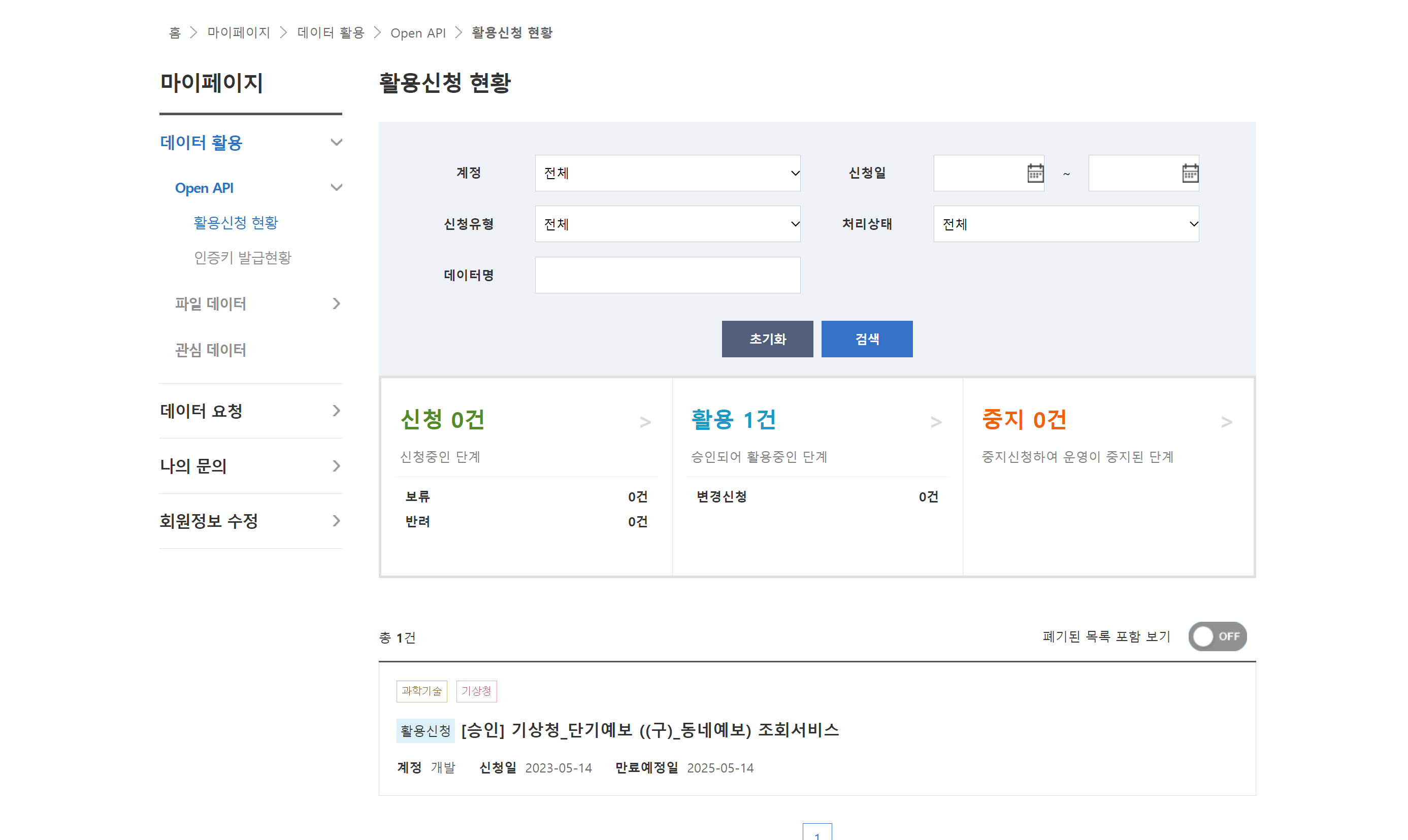 6. 키 발급 (마이페이지 - 오픈 API - 인증키 발급현황)
