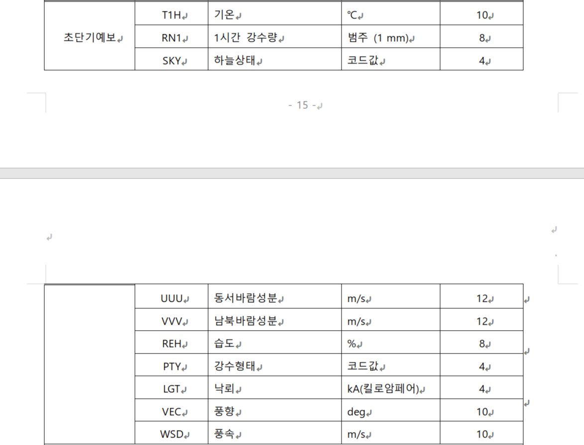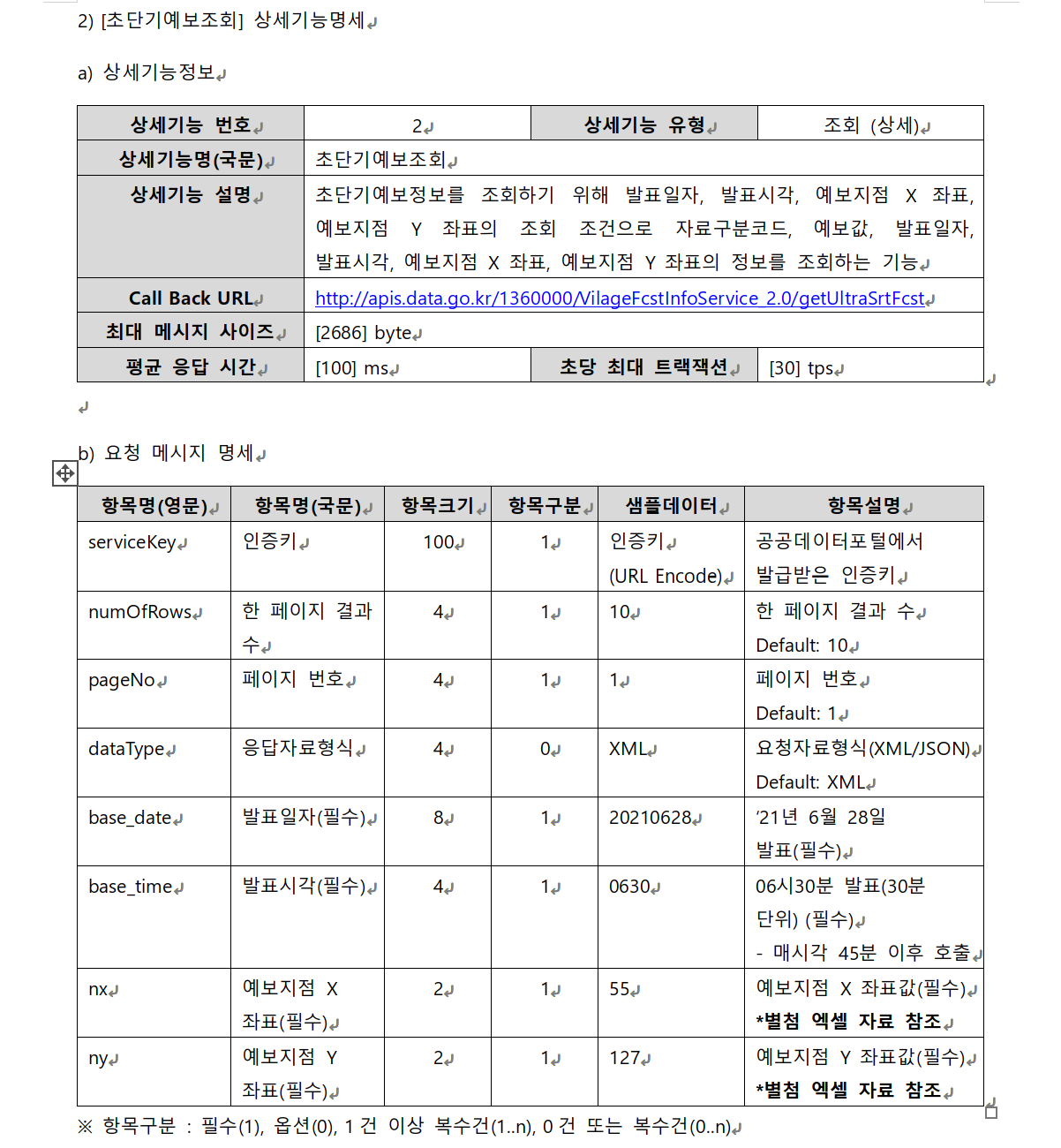 4번에서 알집 파일을 풀어보면 가이드북이 있습니다. 왼쪽은 API를 사용하기 위한 요청 메세지 명세고 오른쪽은 전달되는 데이터들입니다. 해당 데이터를 이용하여 설계를 해보도록 하겠습니다.