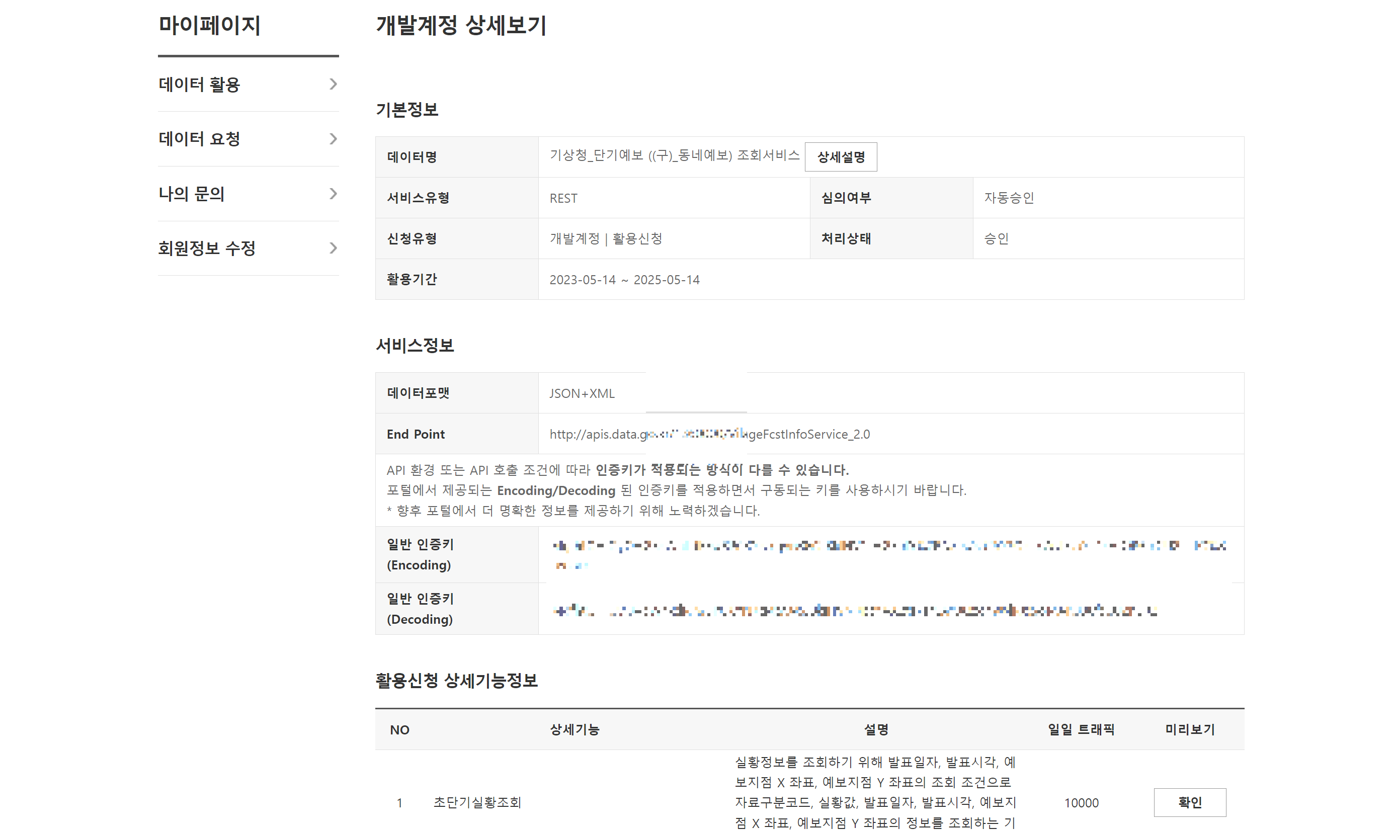 여기서 일반 인증키가 API 인증키를 입니다. (보안을 위해 모자이크 처리를 하였습니다.) 각자 받은 인증키를 사용하면 됩니다.