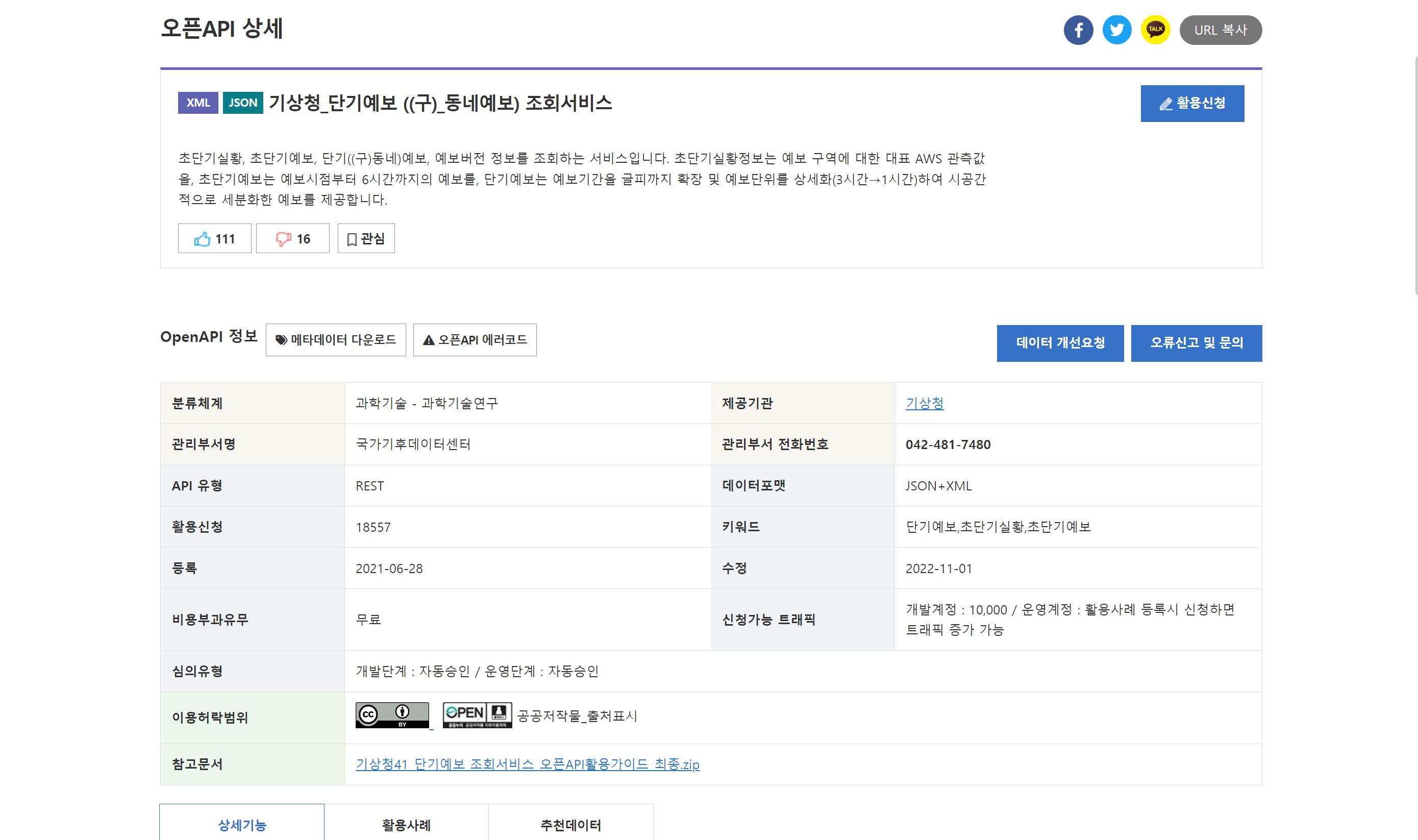 여기서 단기예보를 사용할 것이기 때문에 기상청_단기예 ((구)_동네예보) 조회 서비스를 사용하겠습니다.