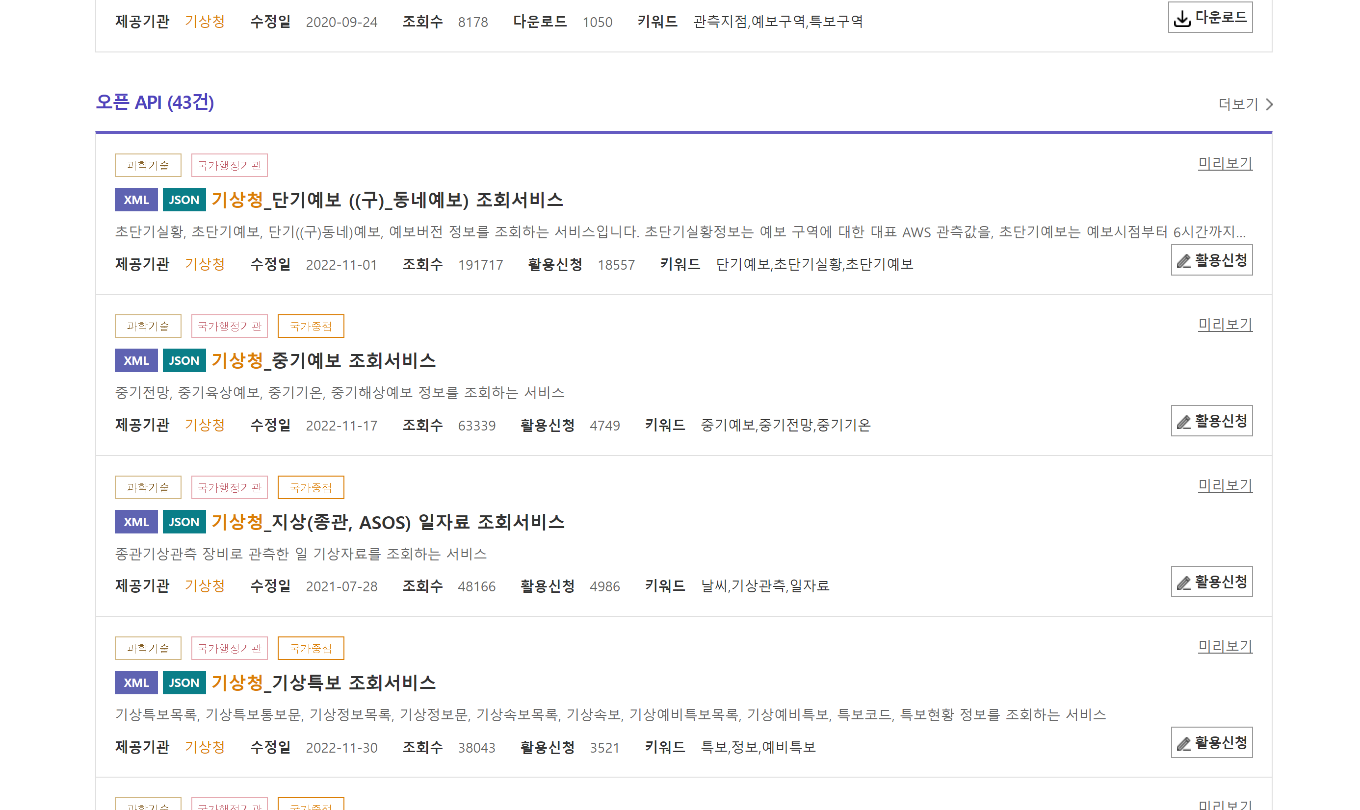 예전에 디시인사이드 크롤러를 만든적이 있었습니다. 크롤러를 이용하여 웹사이트의 소스코드를 복사하고 해당 데이터를 가공하여 사용할수 있었습니다. 크롤링과 다르게 가공된 정보를 가져올수 있는 API가 있습니다. 정부에서 운영하는 공공데이터 API가 있는데 제공 데이터를 바탕으로 날씨를 알아보겠습니다.