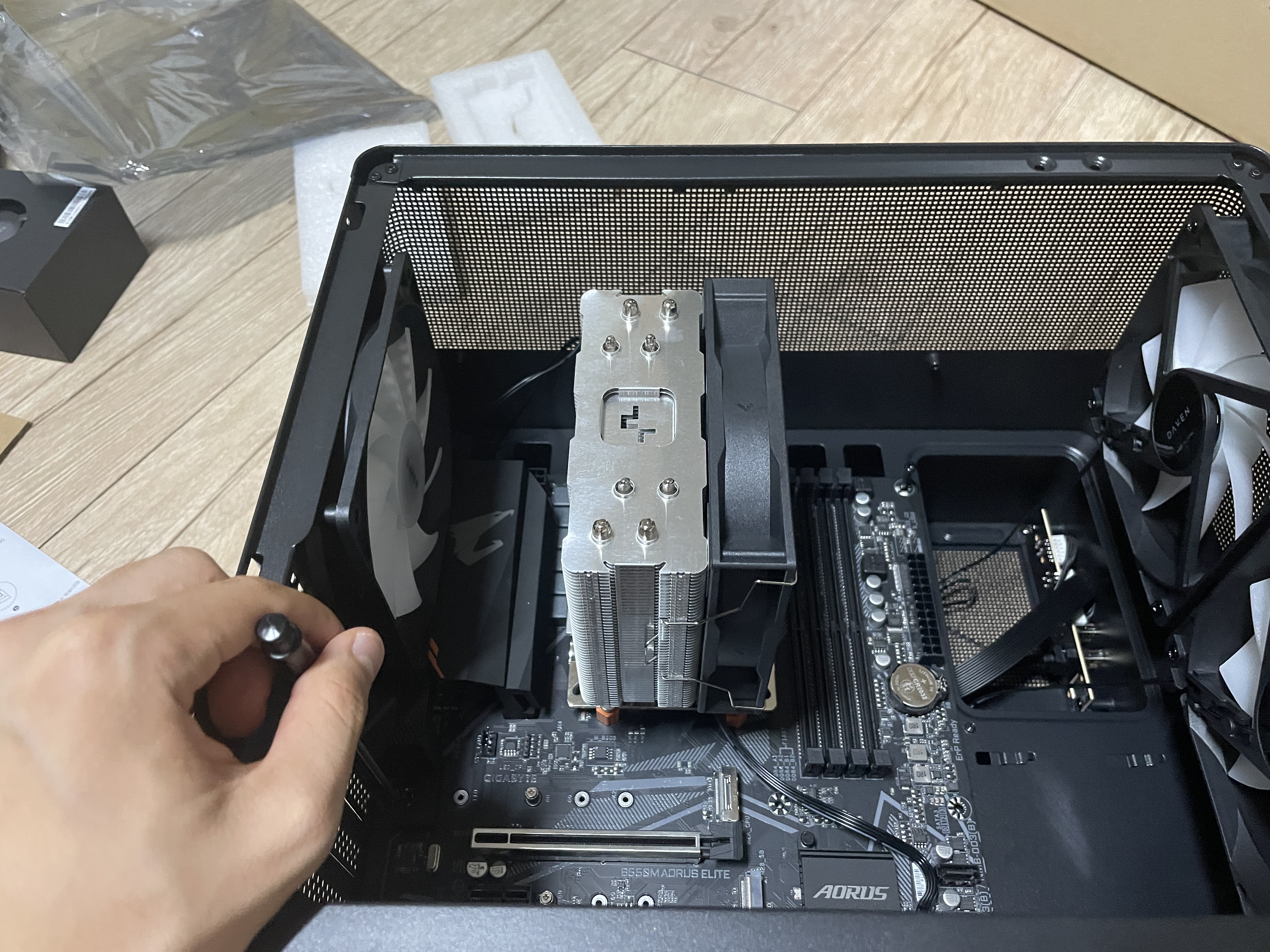 원래는 메인보드가 케이스 장착 후 케이스에 있는 슬롯에다가 SSD나 HDD를 넣습니다. 하지만 저는 M.2 슬롯을 사용하는 SSD를 사용해서 메인보드 케이스 결합 전에 장착했습니다. M.2 슬롯을 사용하는 SSD는 나사를 풀고, 해당 슬롯에 SSD를 넣고 결합하면 조립이 완료됩니다.