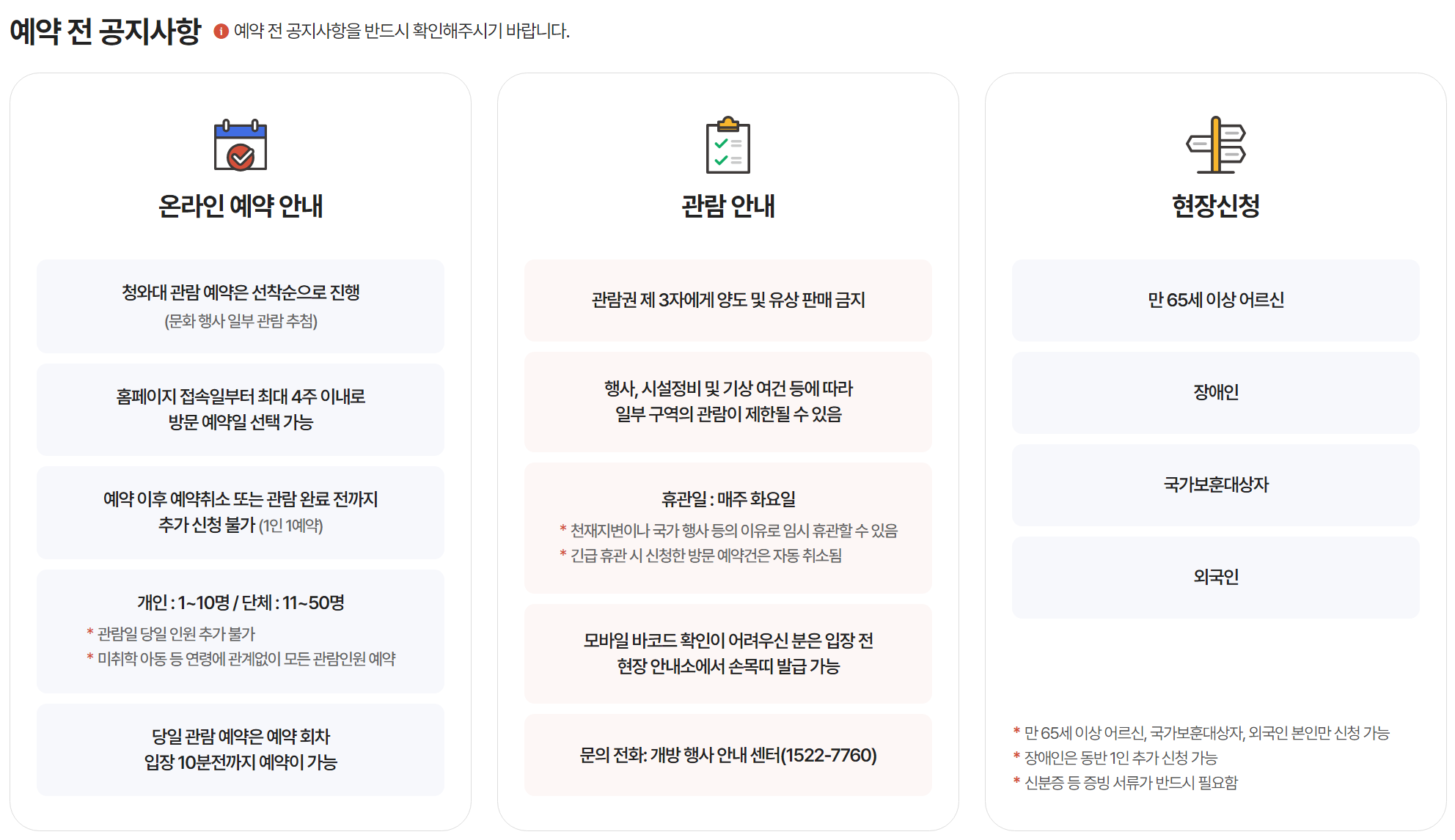 청와대에 방문하려면 사전에 관람 예약을 해야 합니다. 관람 예약을 하는 방법은 아래에, 링크에 접속하여 관람 예약을 하면 됩니다.