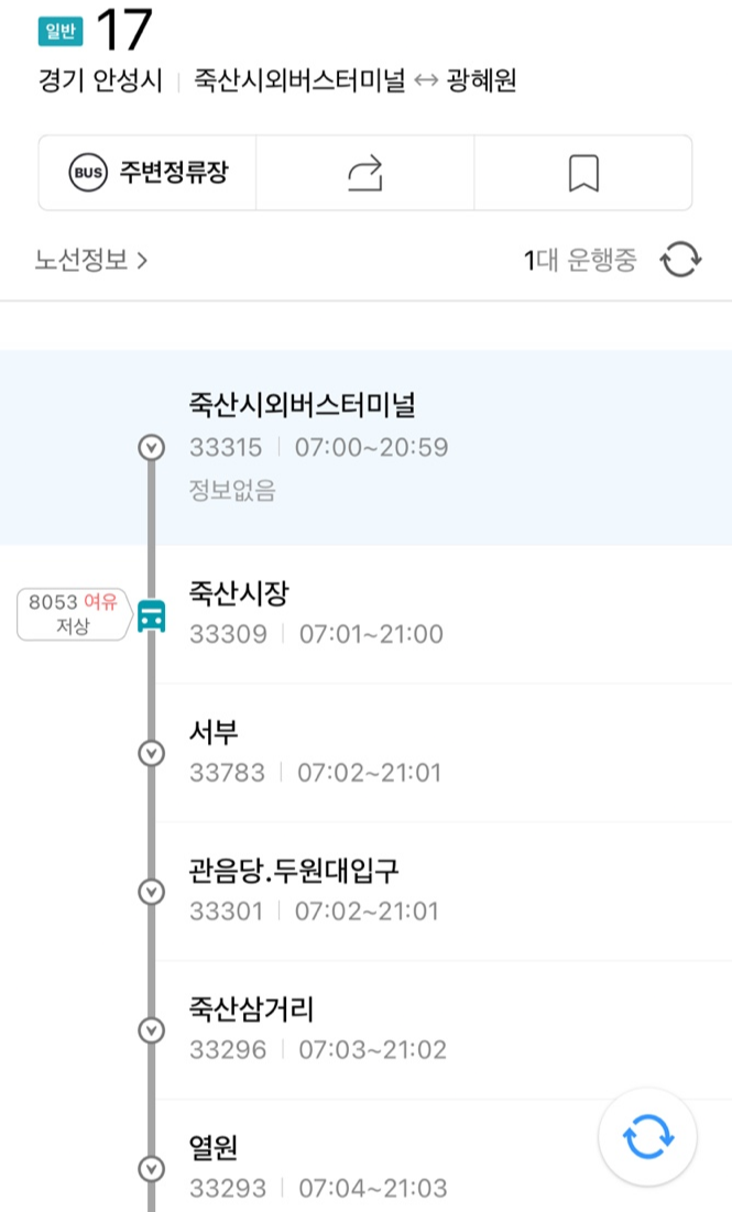 죽산터미널에서 안성 17번으로 타고 광혜원으로 가야 합니다. 해당 버스가 직전에 출발한 것처럼 보여 바로 뛰어갔습니다. 하지만 해당 기록은 사실이 아니었습니다. 기다렸다가 다음 버스에 탑승하였습니다.