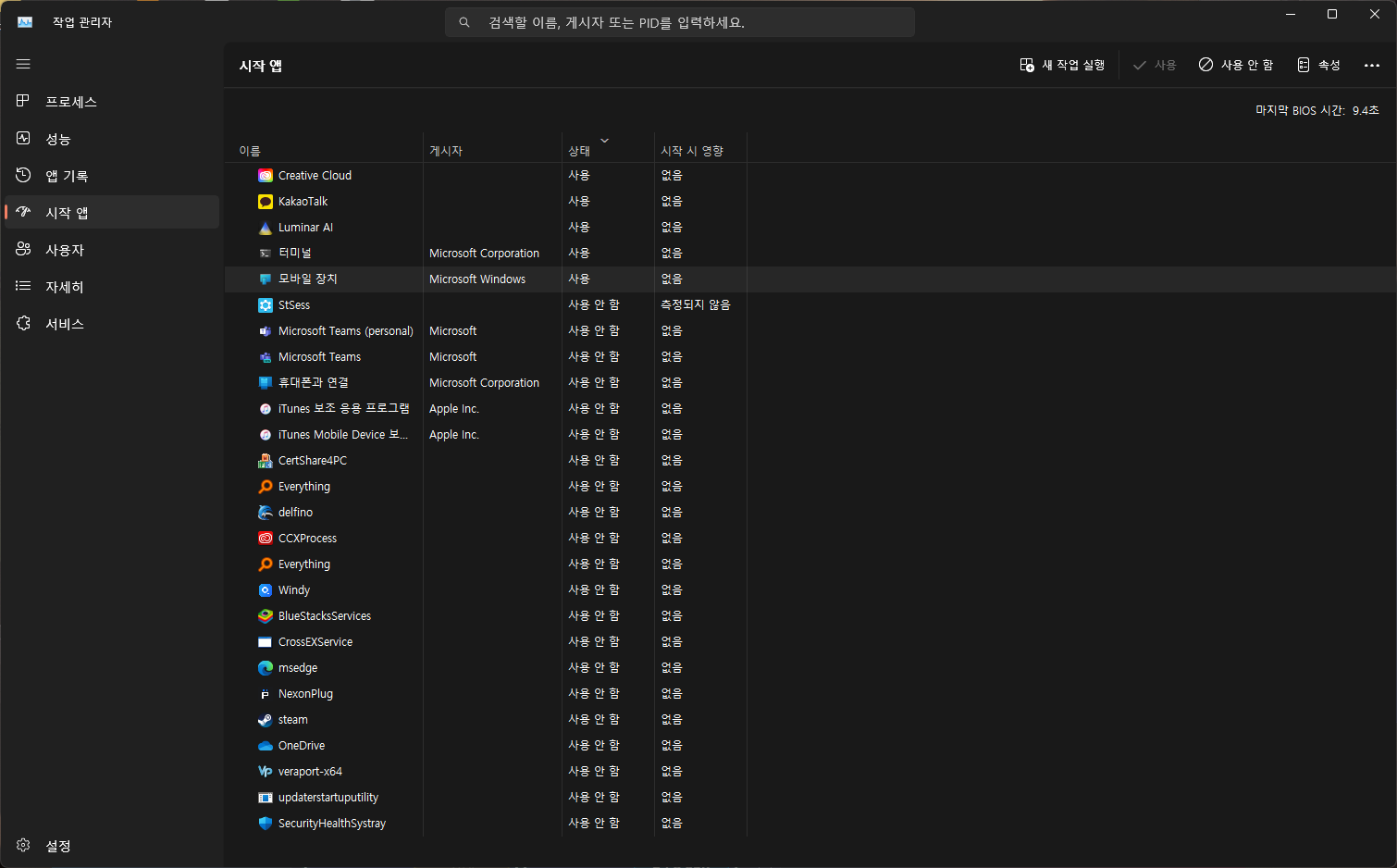 시작 앱에서 필수적으로 사용한 프로그램을 제외하고 나머지는 전부다 '사용 안 함' 하였습니다. 처음에 실행할때 발생한 것으로 볼때 프로그램을 비활성화 하는 방향으로 해결하려고 하였습니다.