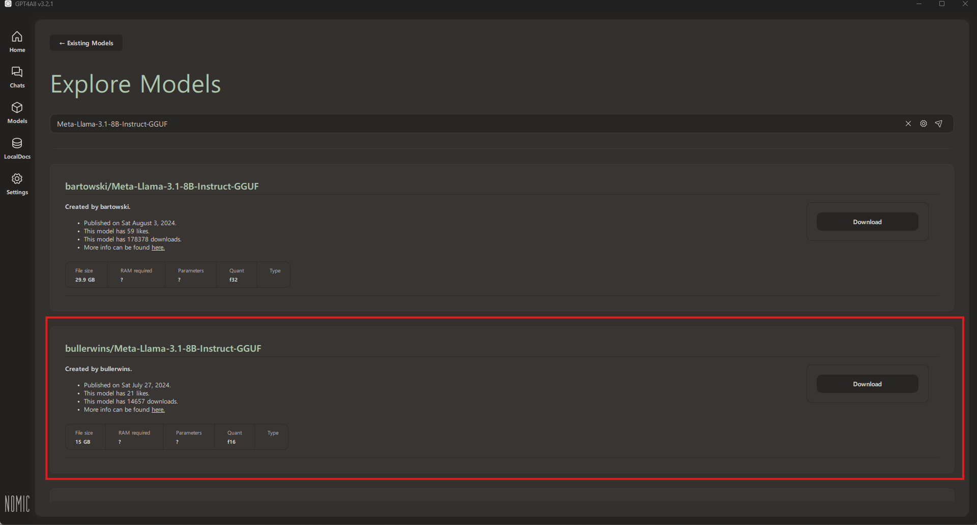 여기서 Meta-Llama-3.1-8B-Instruct-GGUF을 검색합니다. 그 후 원하는 프로젝트를 다운로드합니다. 꼭 해당 프로젝트일 필요 없고 hugging face에서 자신이 찾는 모델을 넣는 것도 좋은 방법입니다.