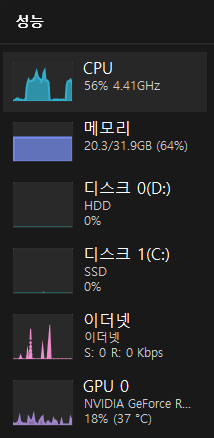 간단한 질문을 돌릴시 시스템 리소스는 아래 그래프와 같습니다. (라이젠5 5600, GTX3060 12GB)