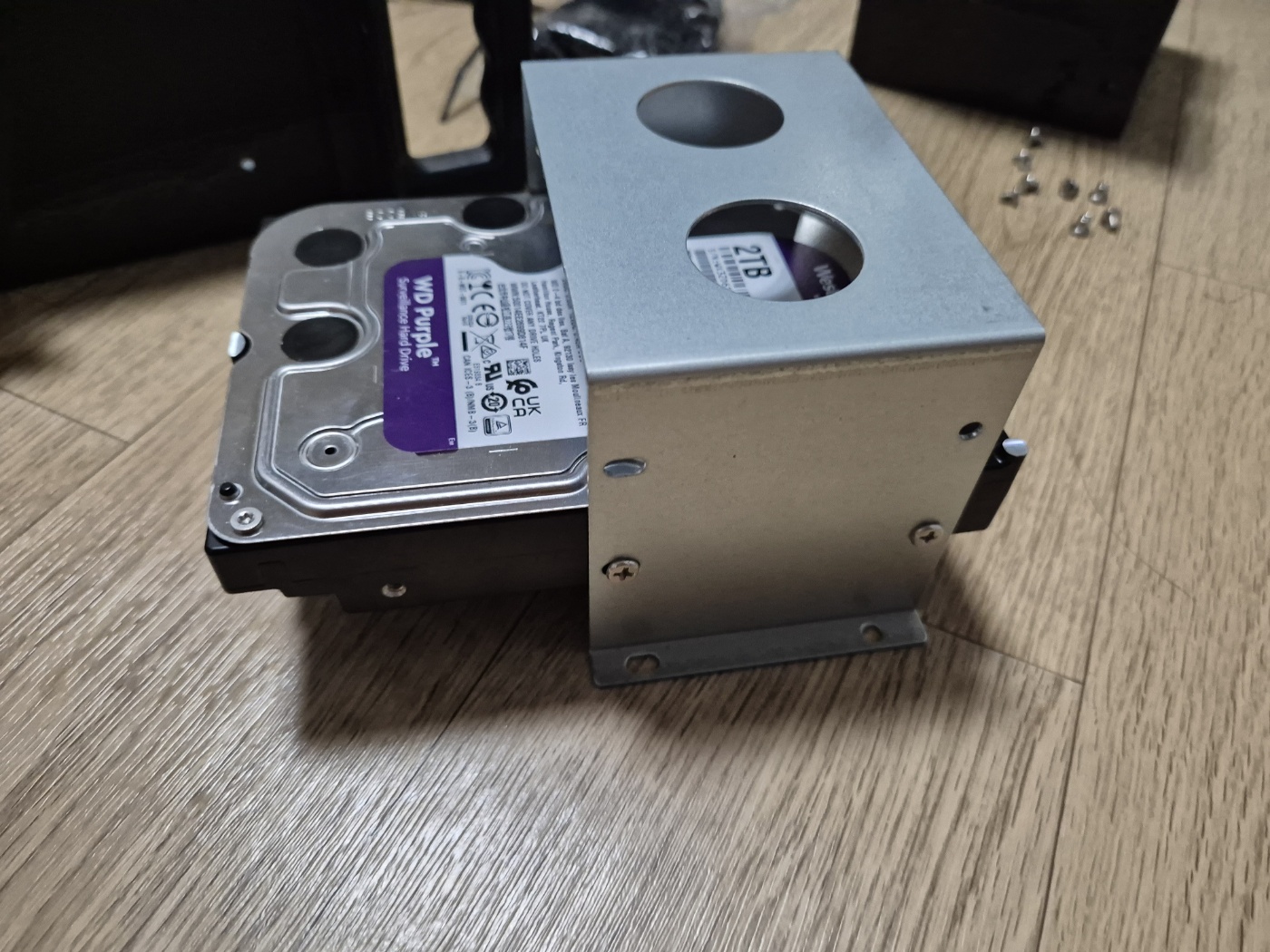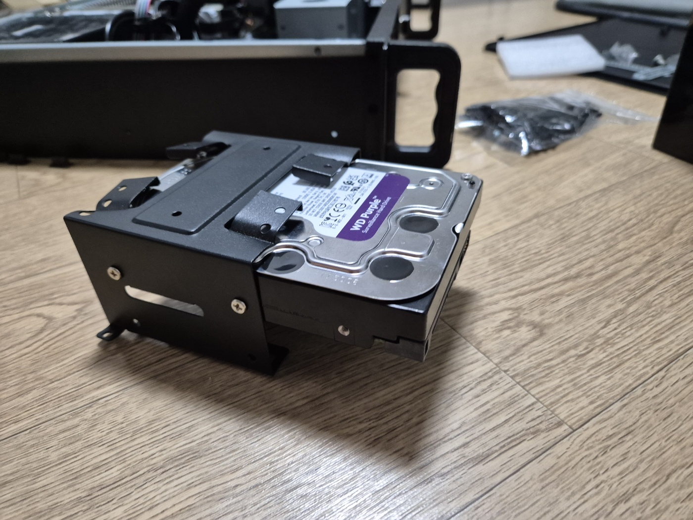 기존 케이스에 하드 디스크 부분을 일부 제거하여 5.25인치에 묶어서 조치했습니다.