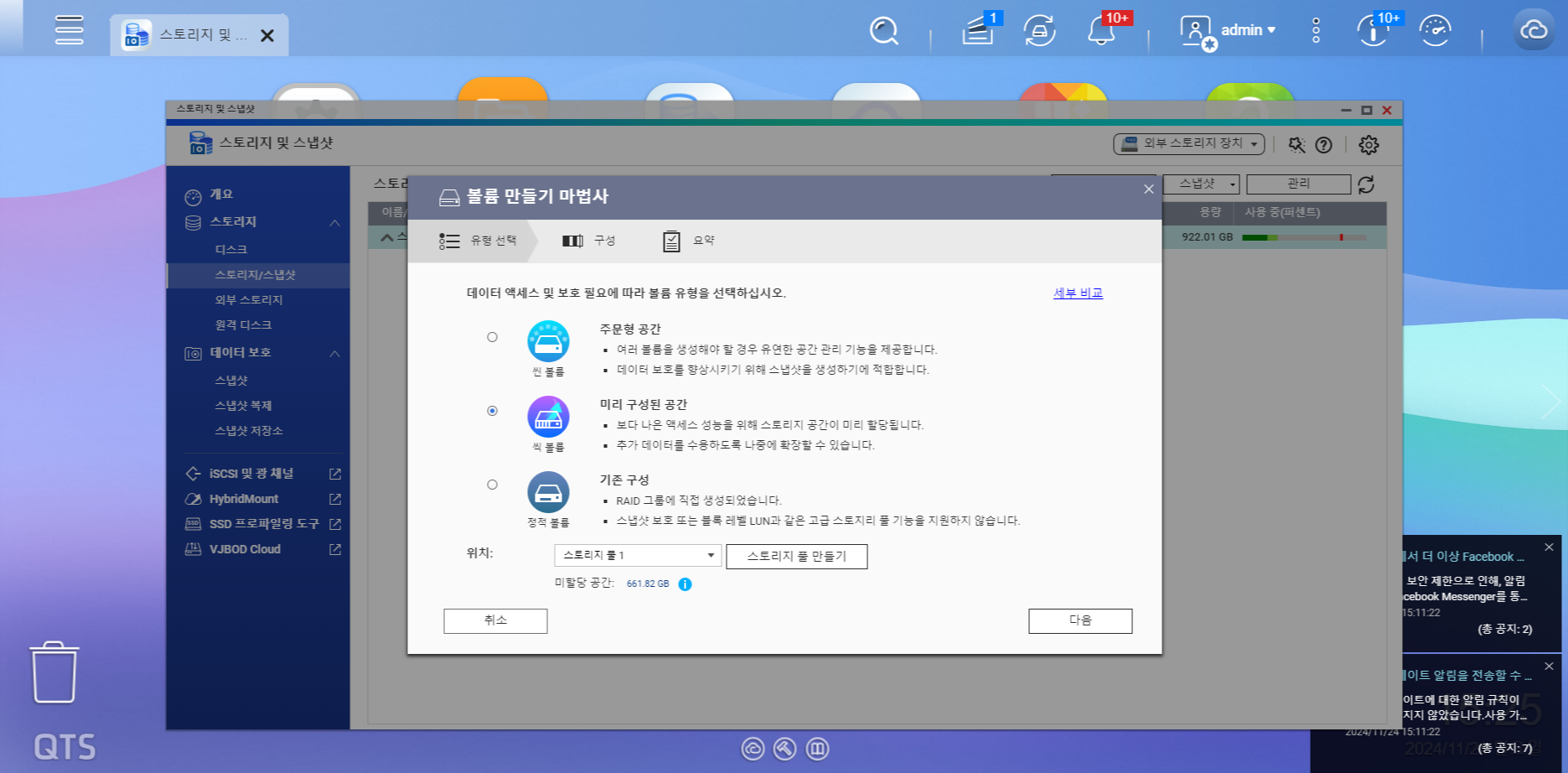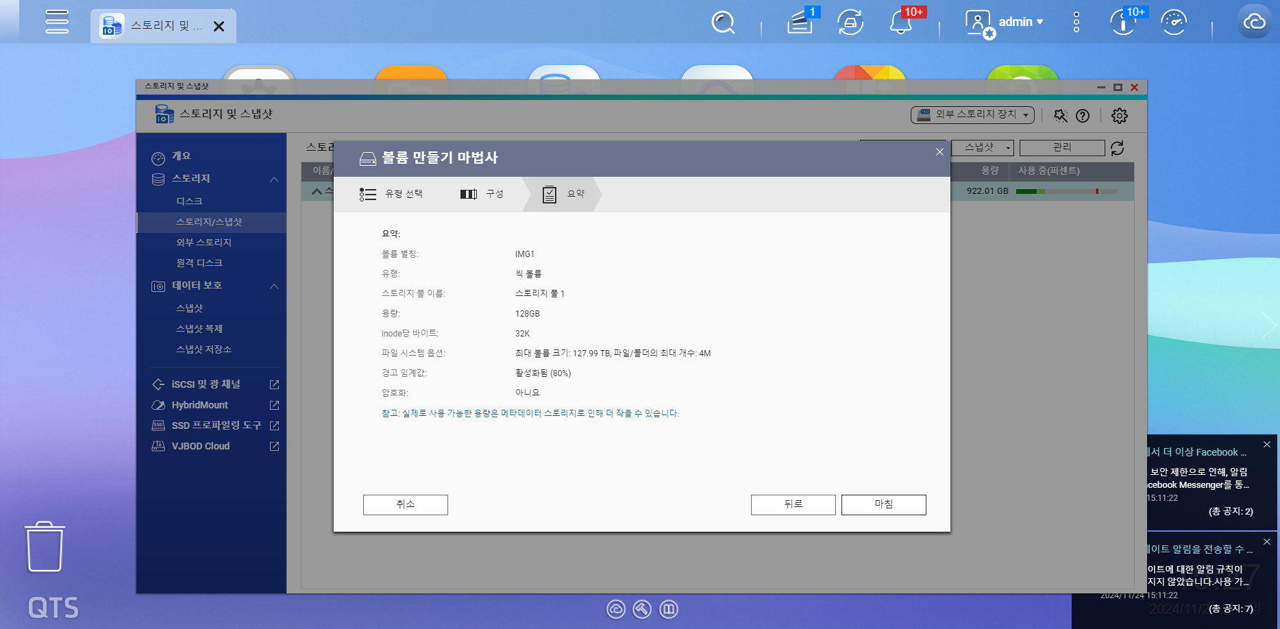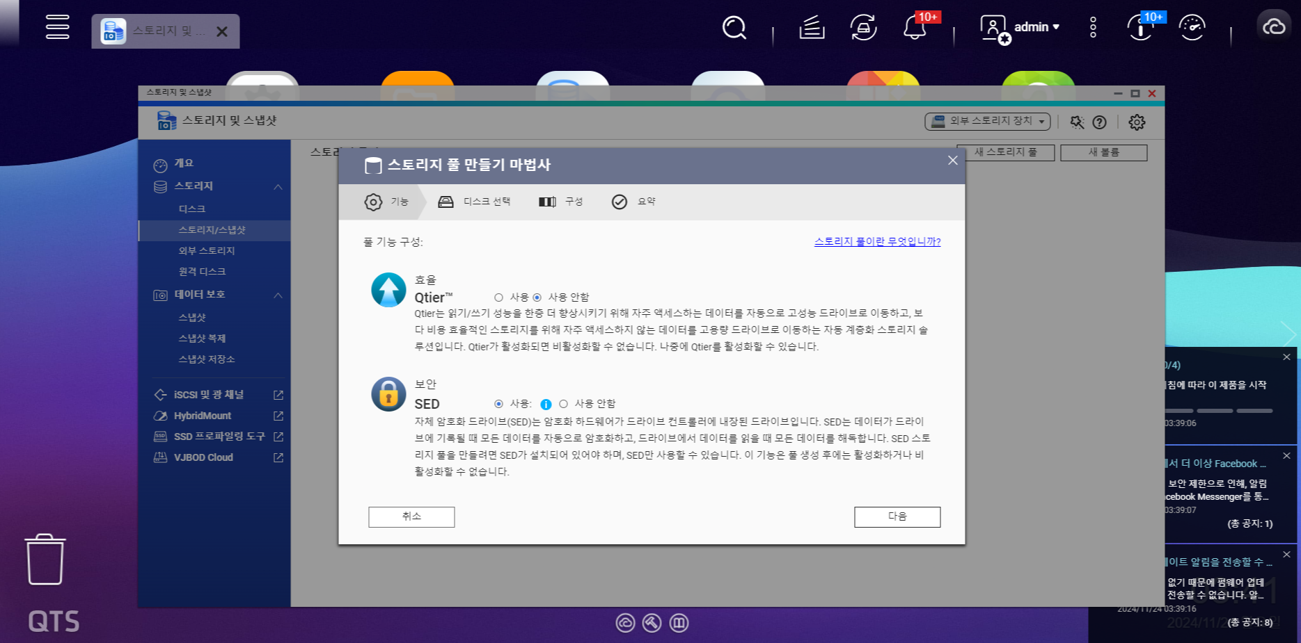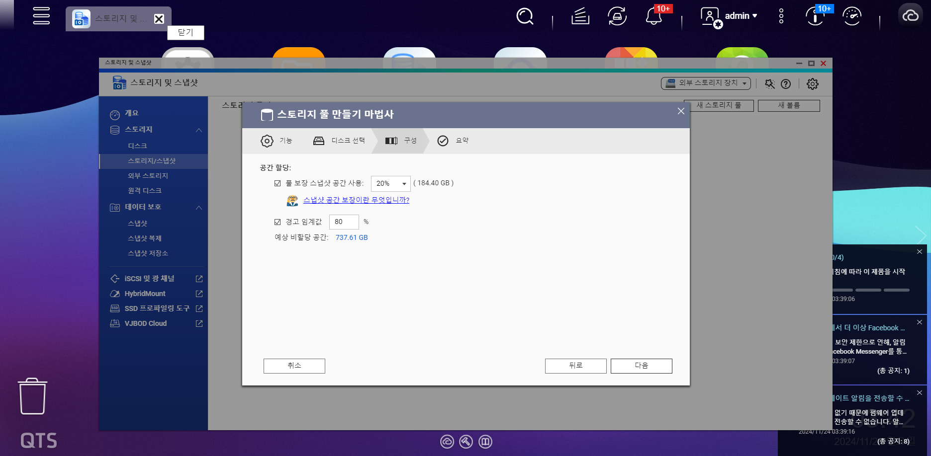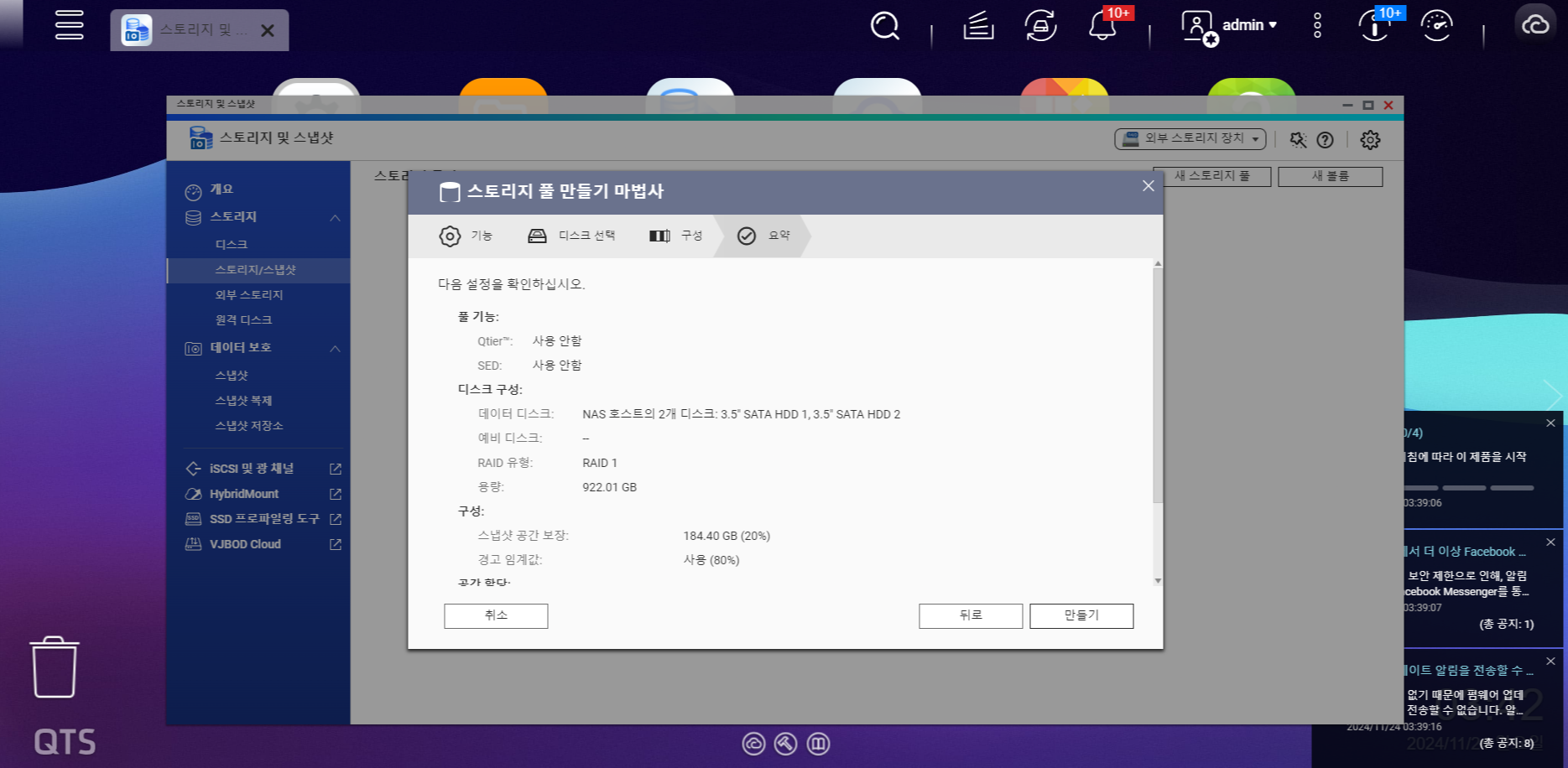 이 두 부분이 가장 중요합니다. RAID 구성 및 스냅샷을 정하는 부분입니다.