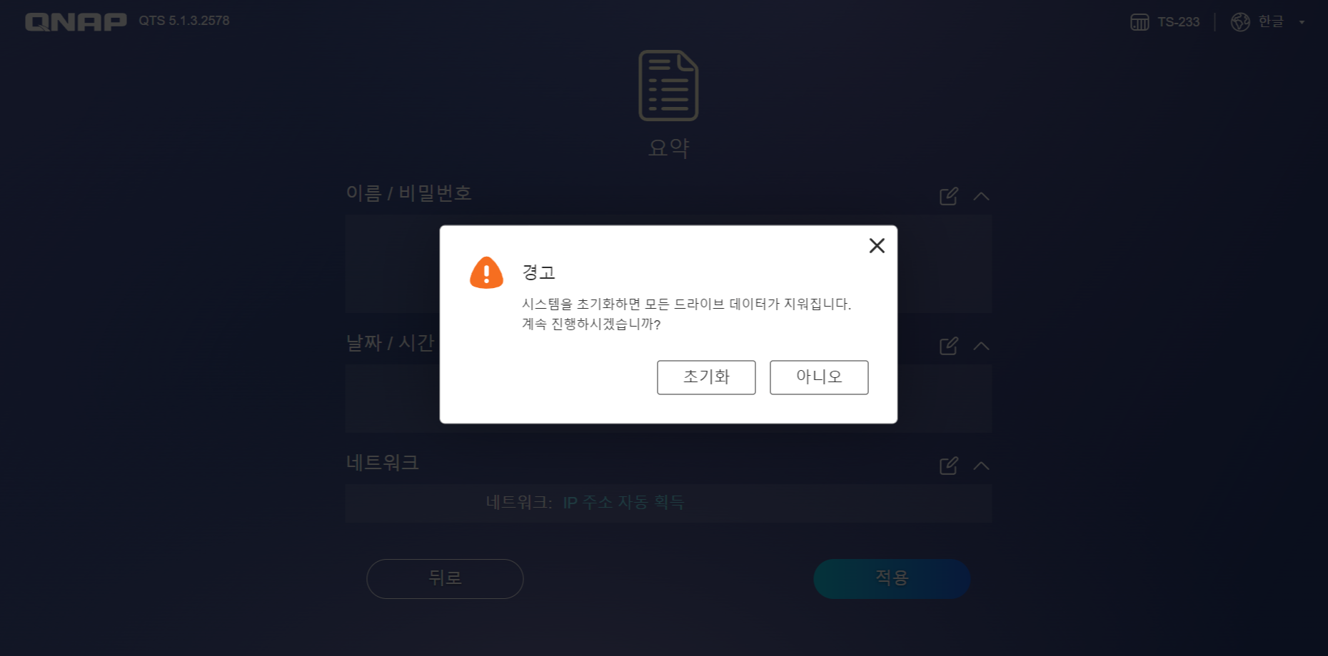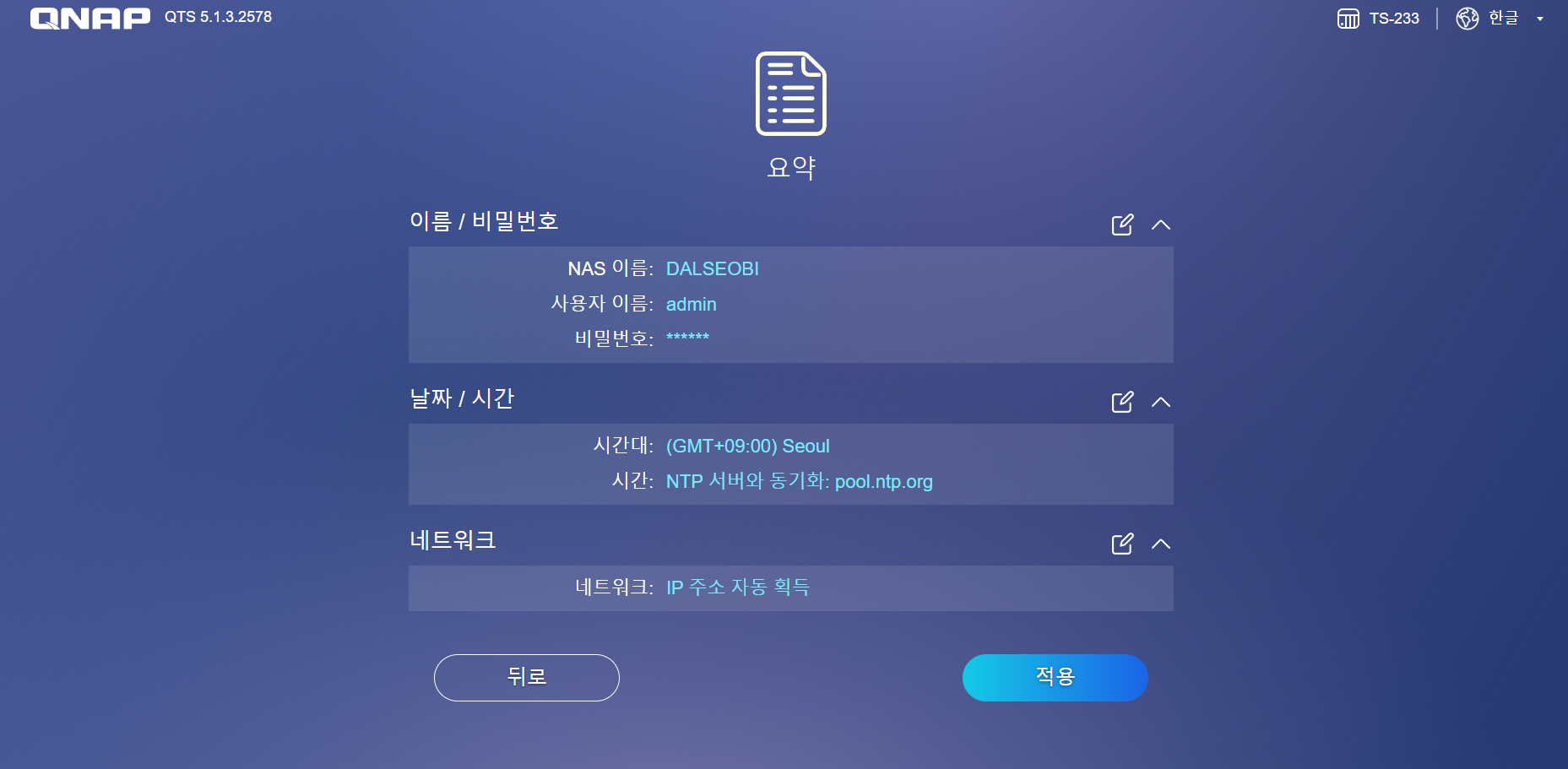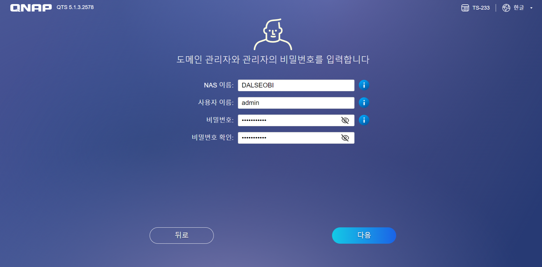 NAS 이름과 사용자 이름 비밀번호를 입력합니다. 사용자 이름과 비밀번호는 중요하니 꼭 잊어 버리지 맙시다. 만약에 잃어버린 경우에는 뒷면에 RESET 버튼을 눌러서 10초간 눌러야 합니다. 리셋 정보는 다음과 같습니다.