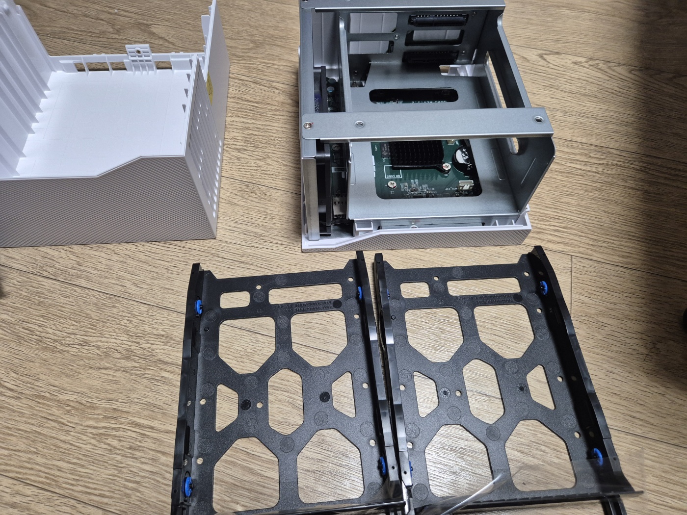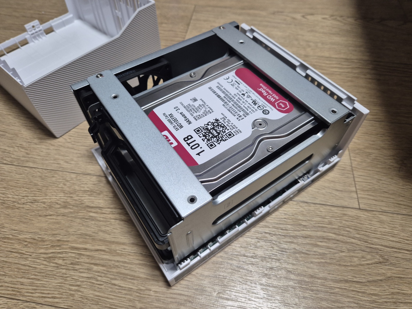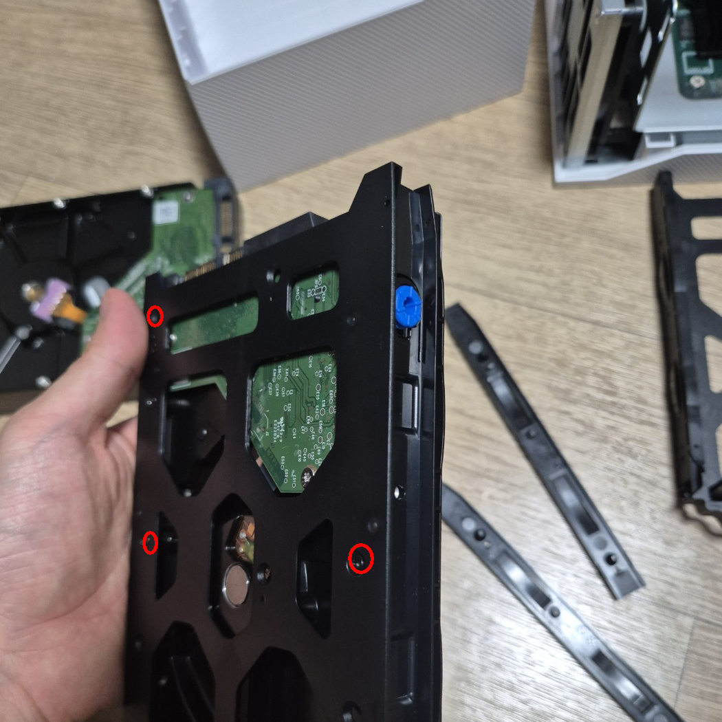 옆에 레일 고정하는 장비를 제거후 디스크를 연결하고 나사를 조이면 프레임이 완성 됩니다. 하드디스크를 연결한 프레임을 다시 연결시키면 완성입니다.