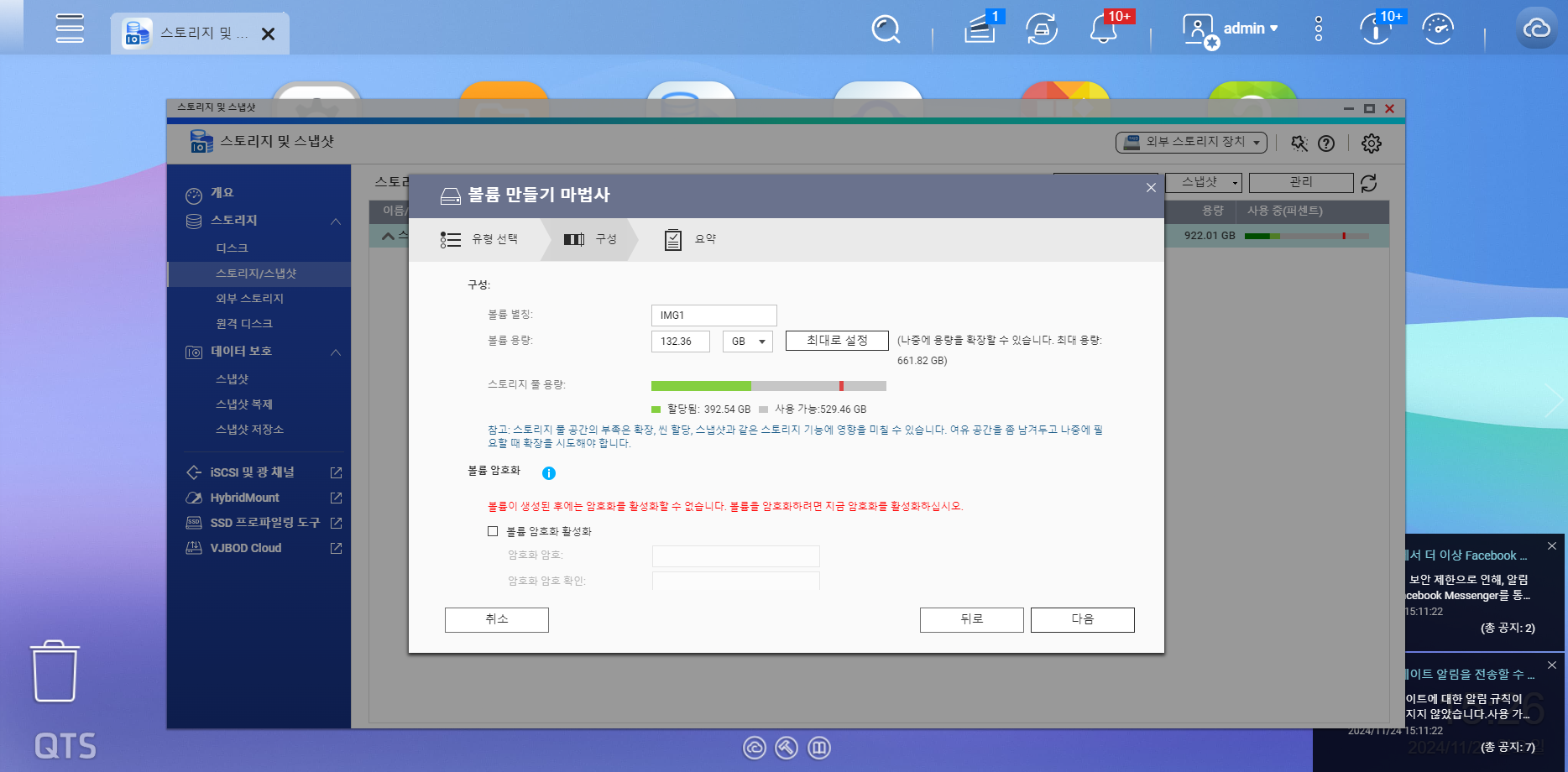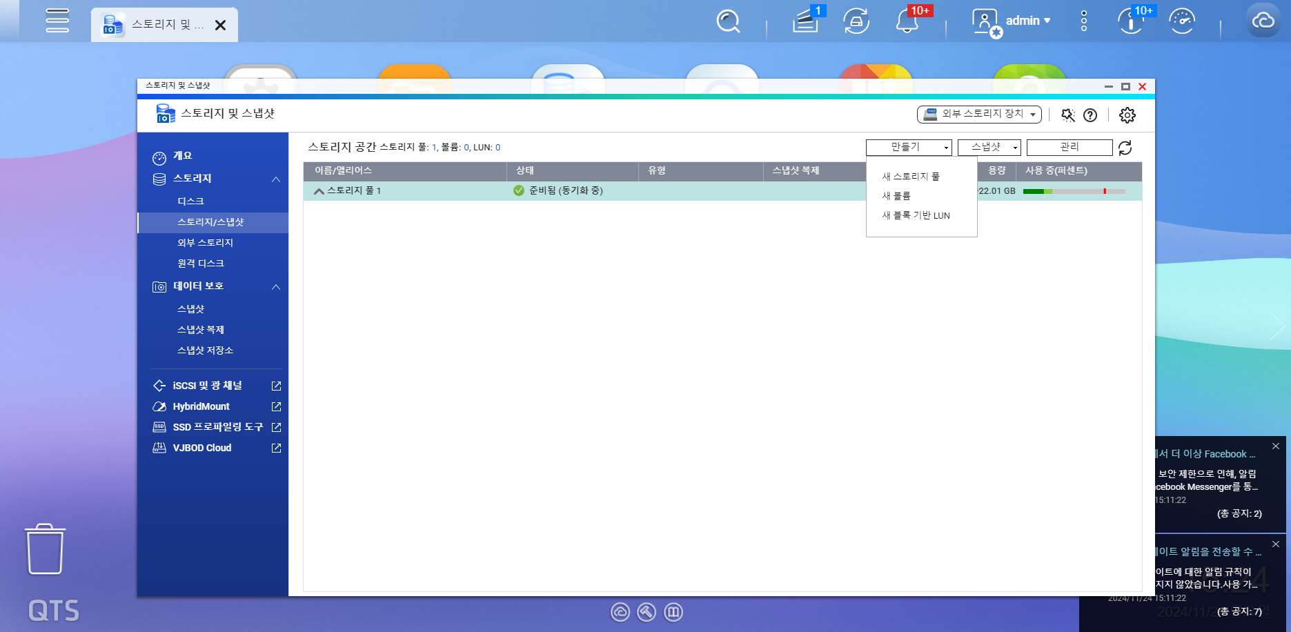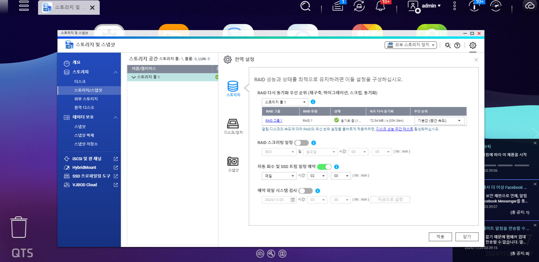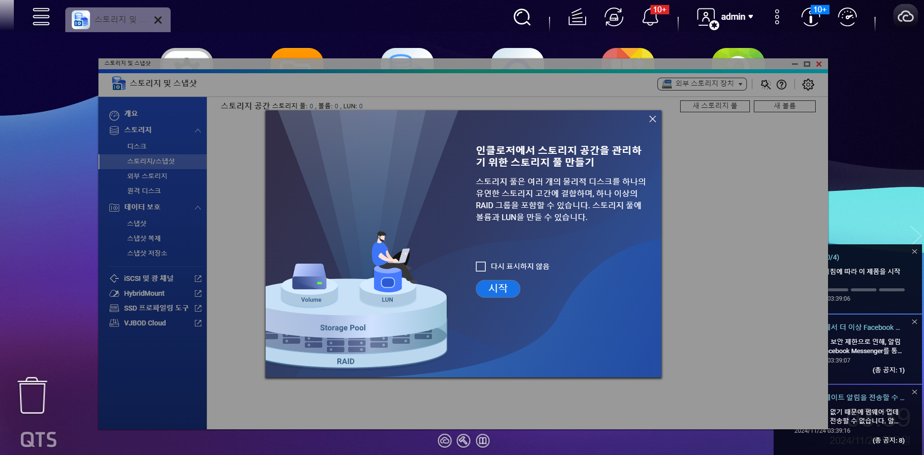 로그인이 되면 RAID를 설정하도록 합니다. 스토리지 및 스냅샷에 들어가도록 합니다.