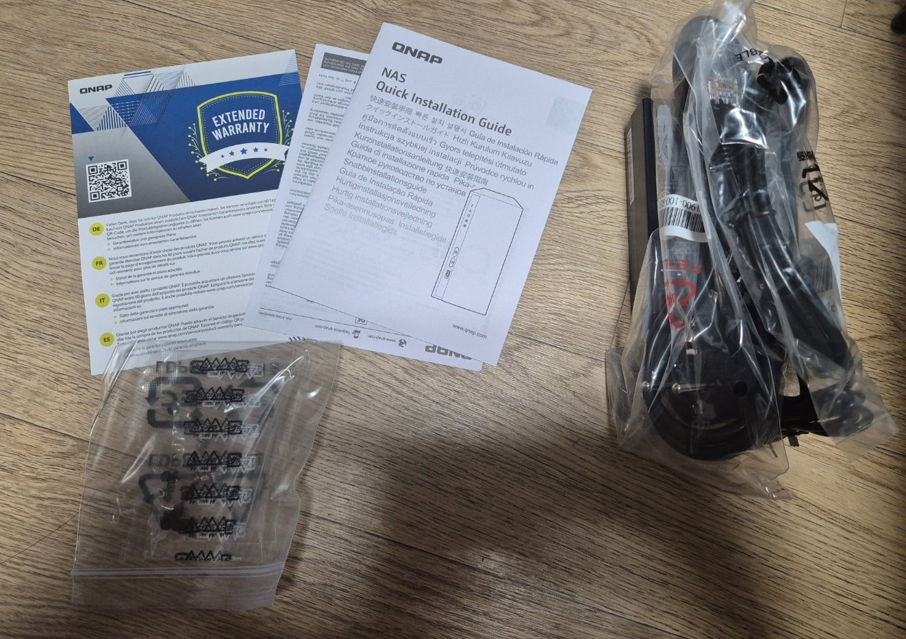 내부 구성품으로는 NAS, 나사, 전원, 설명서, 보증서 이렇게 되어있습니다.