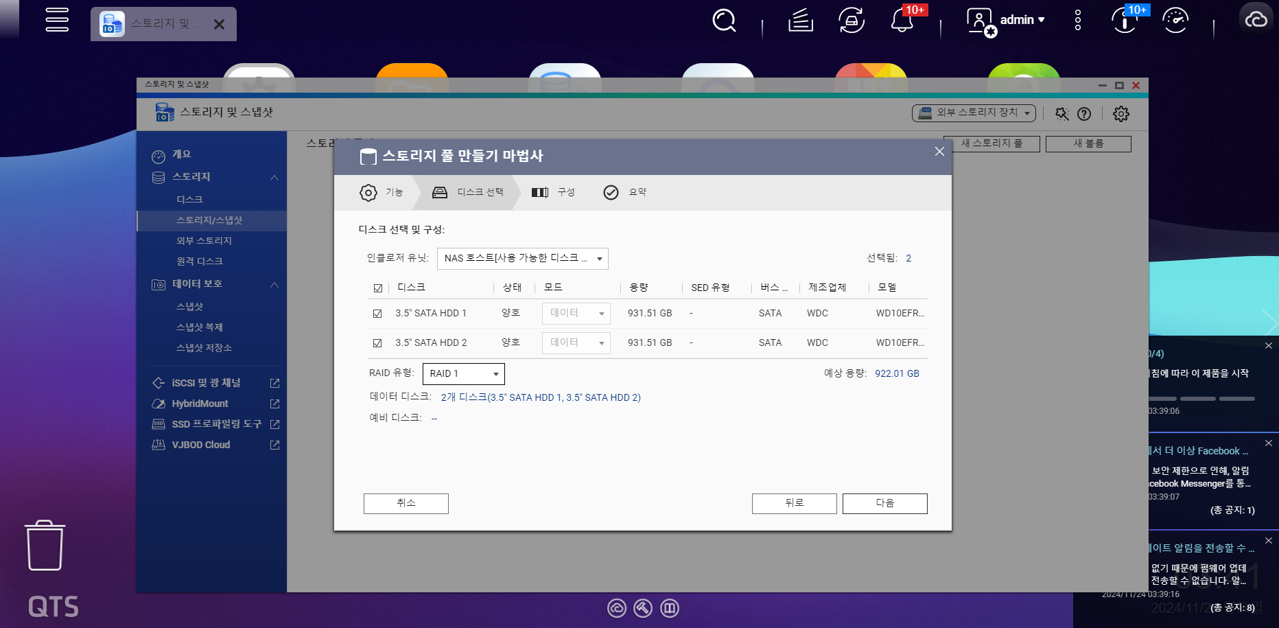 RAID는 하드디스크를 물리적으로 배열하는 방식입니다. 이를 통해 하드디스크를 구성할 수 있습니다. 저 같은 경우에는 백업을 중요하게 생각하여 RAID 1로 구성하였습니다.