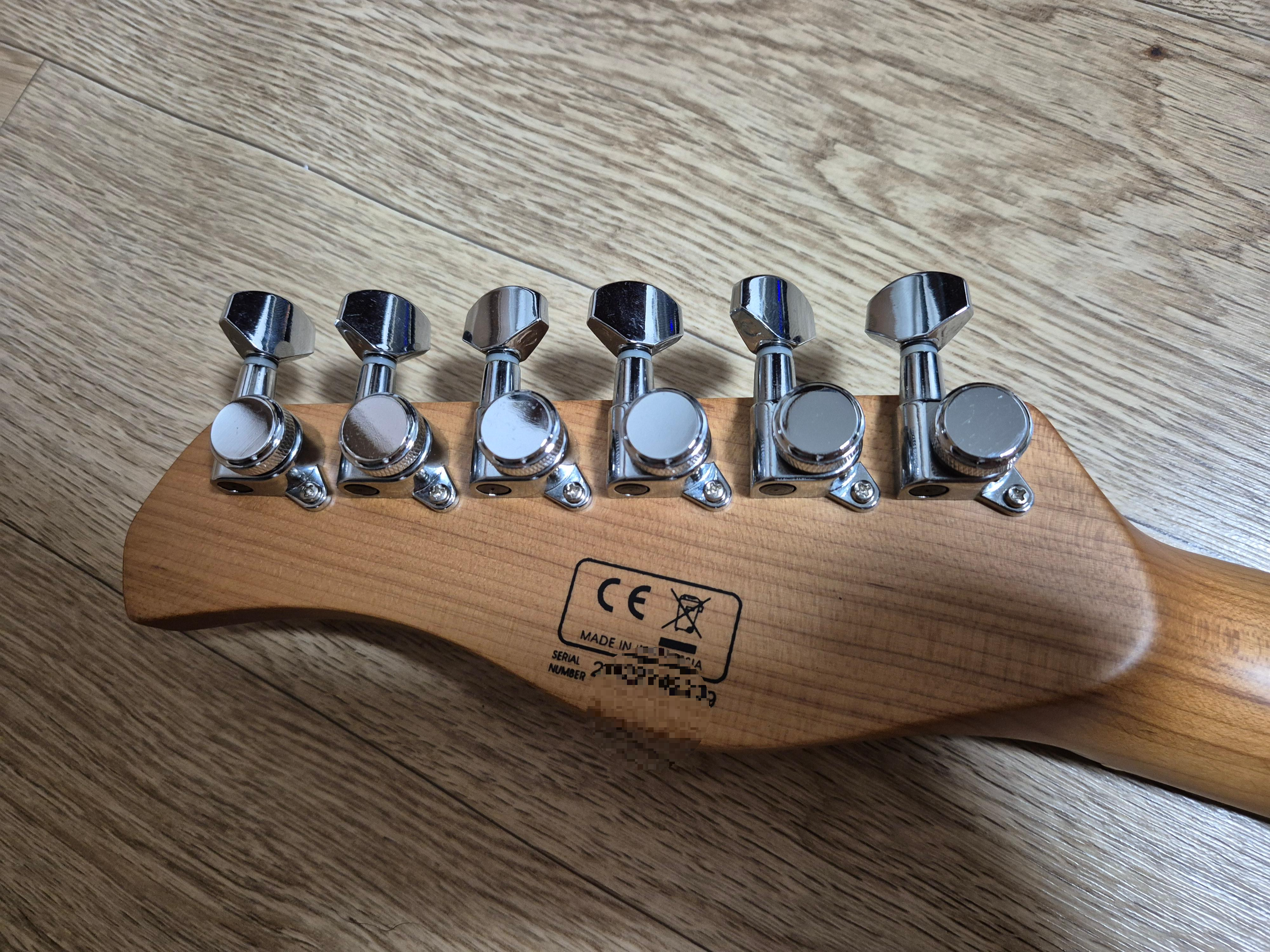 넥은 로스티드 메이플로 제작되어 일반 메이플 대비 따뜻한 톤을 가벼운 무게감을 갖추고 있습니다. 넥은 슬림한 편이라 속주용으로 괜찮아 보이지만 넥아밍 같은 플레이를 하면 부러질 것 같은 느낌이 듭니다. 헤드머신은 락킹 타입이 사용했습니다. 튜닝 빈도가 줄어드는 장점이 있으나, 해당 부분은 사용자의 취향에 따라 호불호가 갈리는 부분인 것 같습니다.