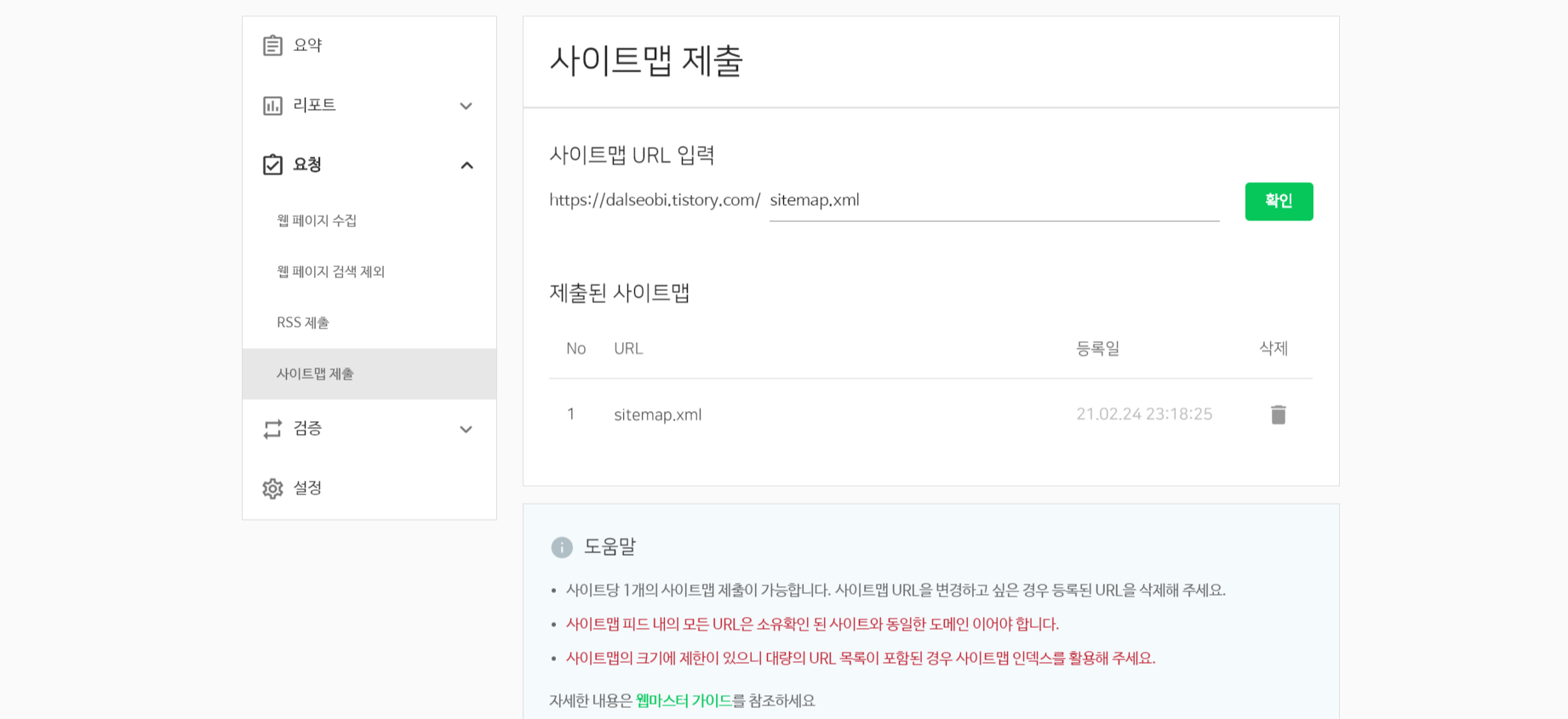 사이트맵이란 'sitemap.xml'인 해당 블로그의 카테고리 및 게시글 정보를 제공하는 xml문서입니다. 사이트맵을 등록하는 경우 자신의 블로그 글의 정보를 빠짐없이 넣을 수 있습니다.
