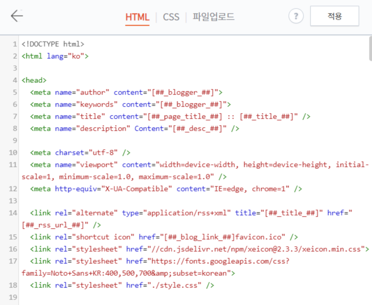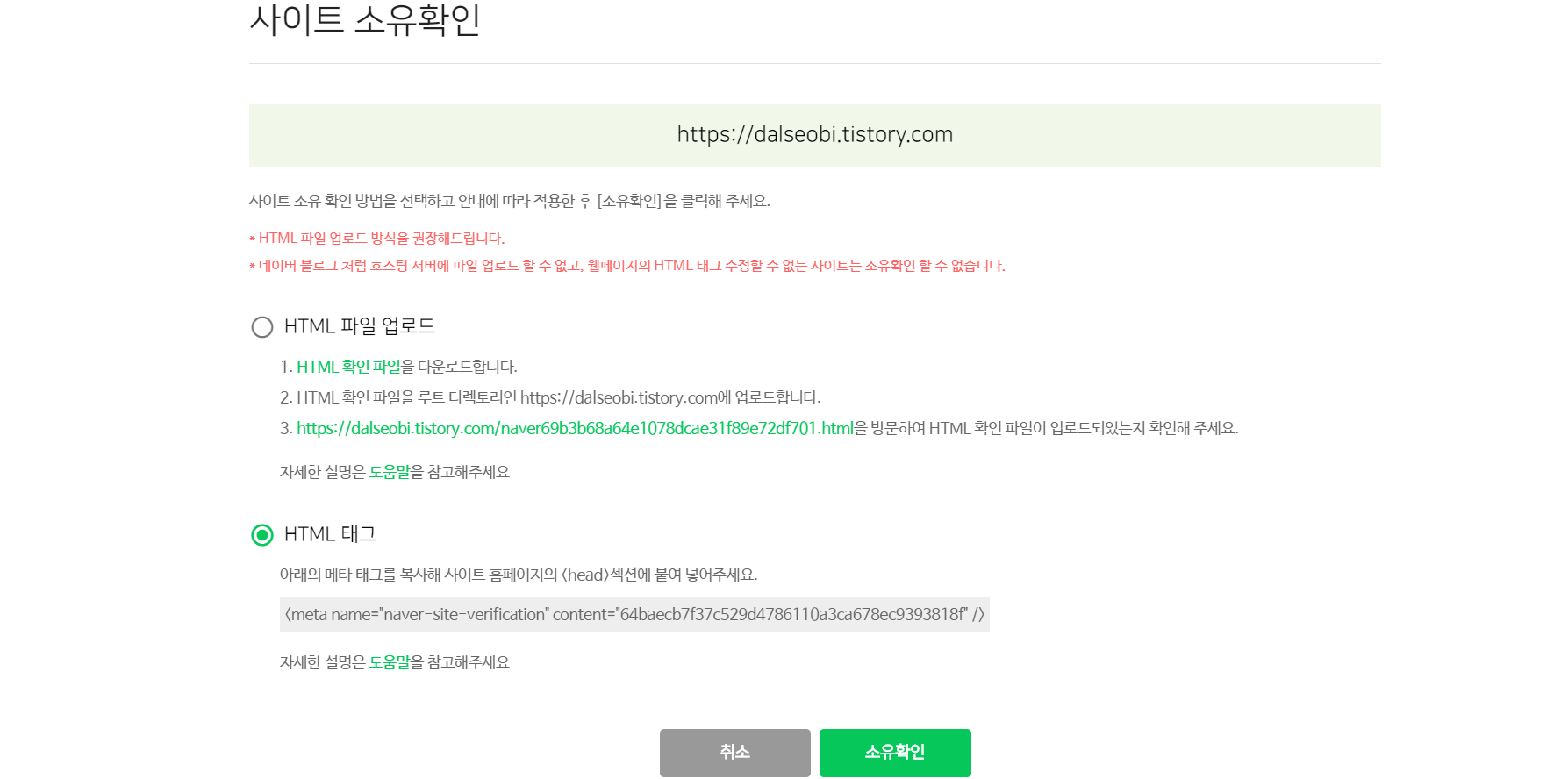 3. HTML 태그에 체크하고 메타태그를 자신의 티스토리 블로그에 설정 - 스킨 편집 - HTML 태그 편집으로 붙여둔다.