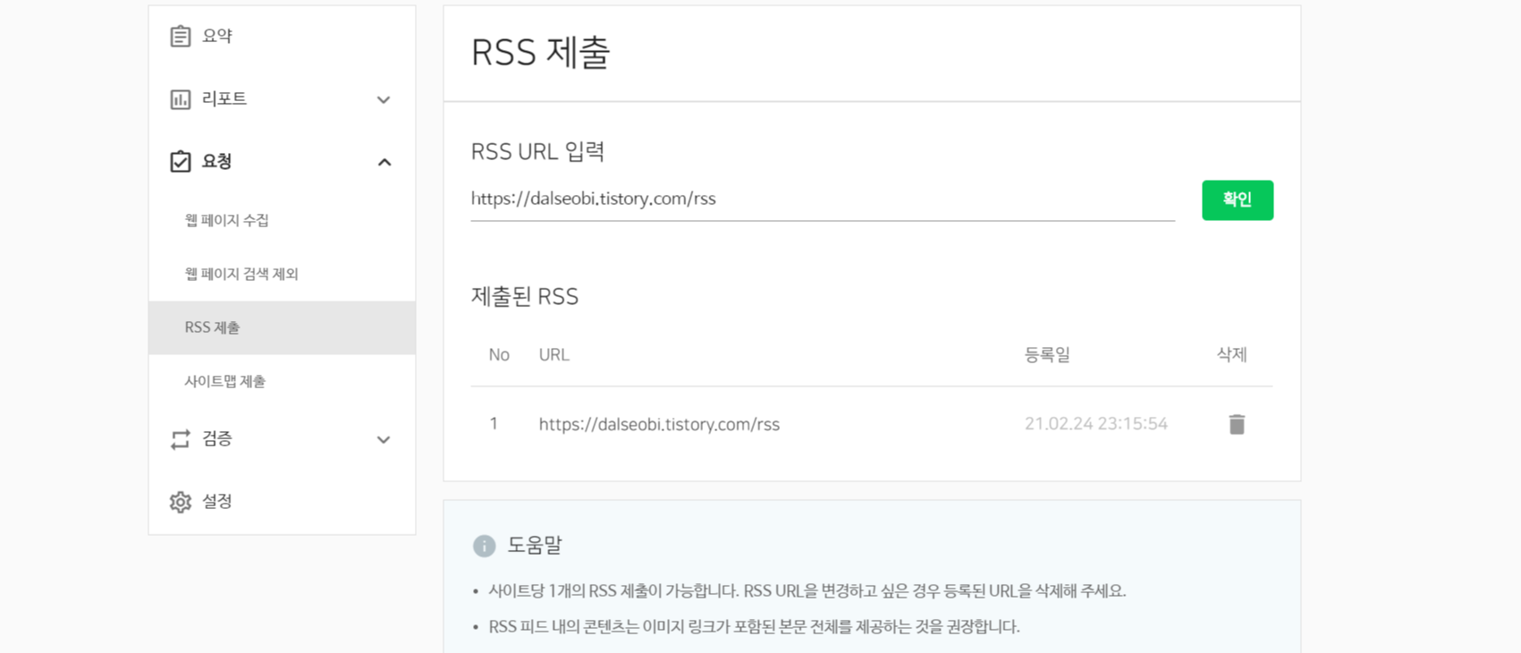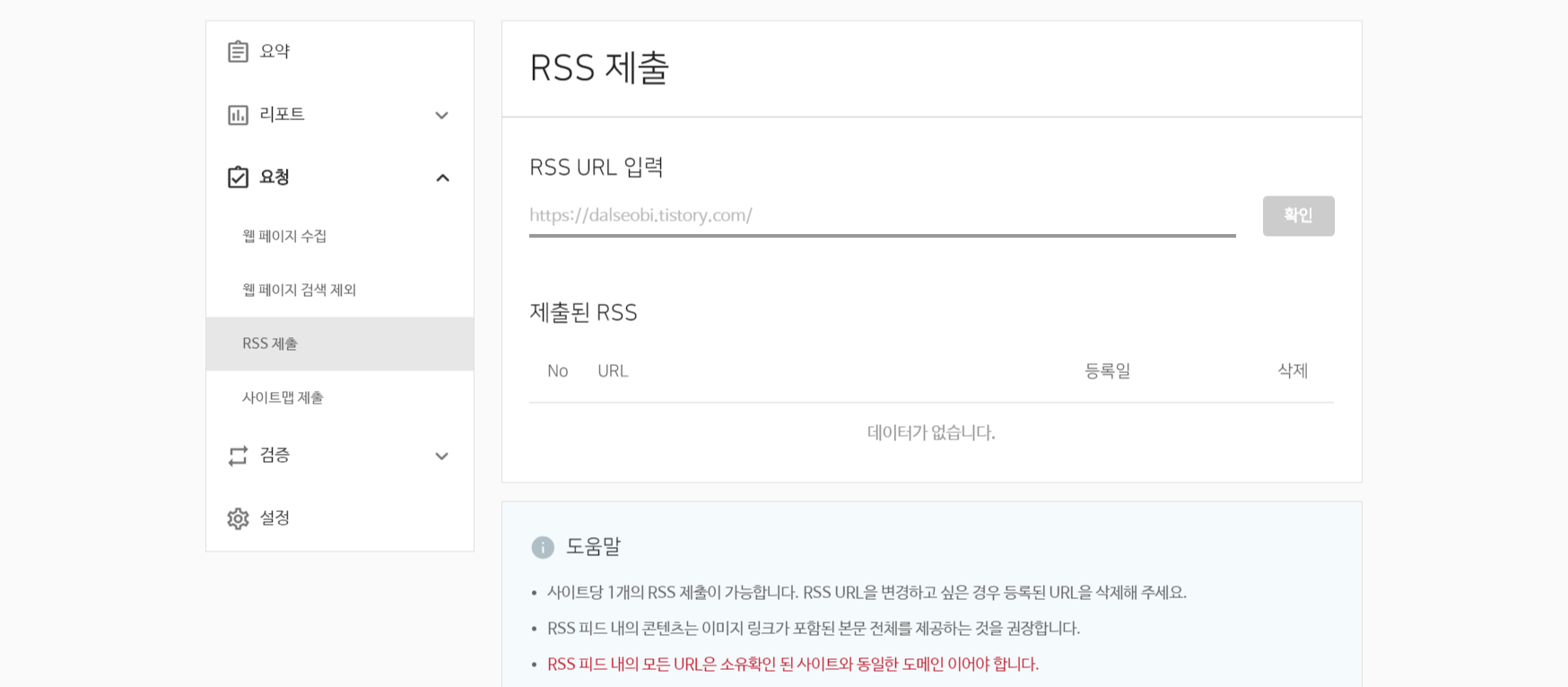 2. 요청 / RSS 제출 버튼을 누르면 해당 버튼이 나온다.