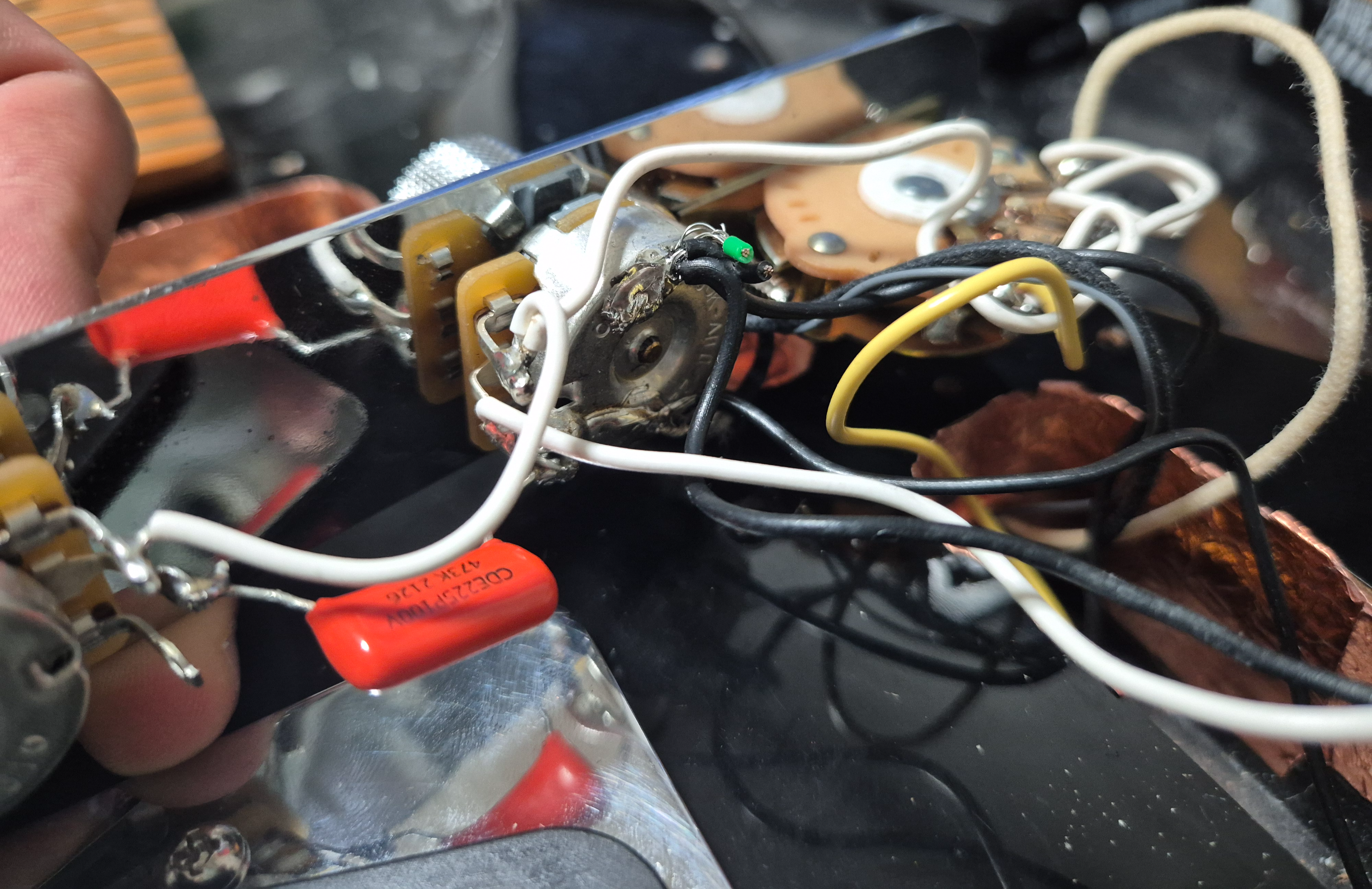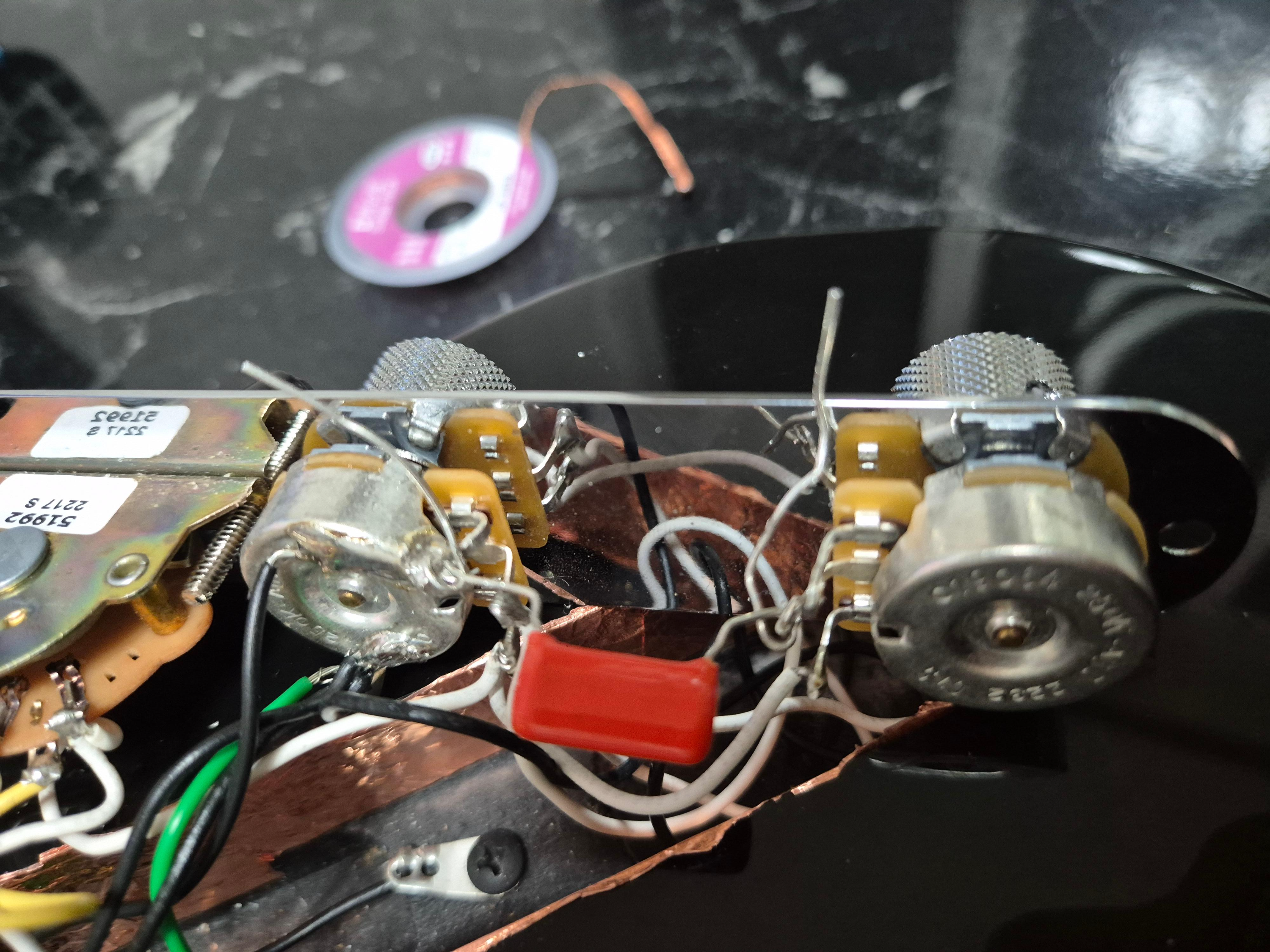 여기서 저는 일단 납땜을 못했습니다. 그래서 노이즈도 다수 발생했습니다. 기타 납땜하면서 가장 중요한 건 피복을 노출시키지 않아야하는 점입니다. 아무리 쉴딩을 하고 여러가지를 시도해도 피복이 노출되어 있으면 전부다 노이즈가 들어옵니다. 그 점을 해결하는 데 많은 시간을 소요하였습니다.
