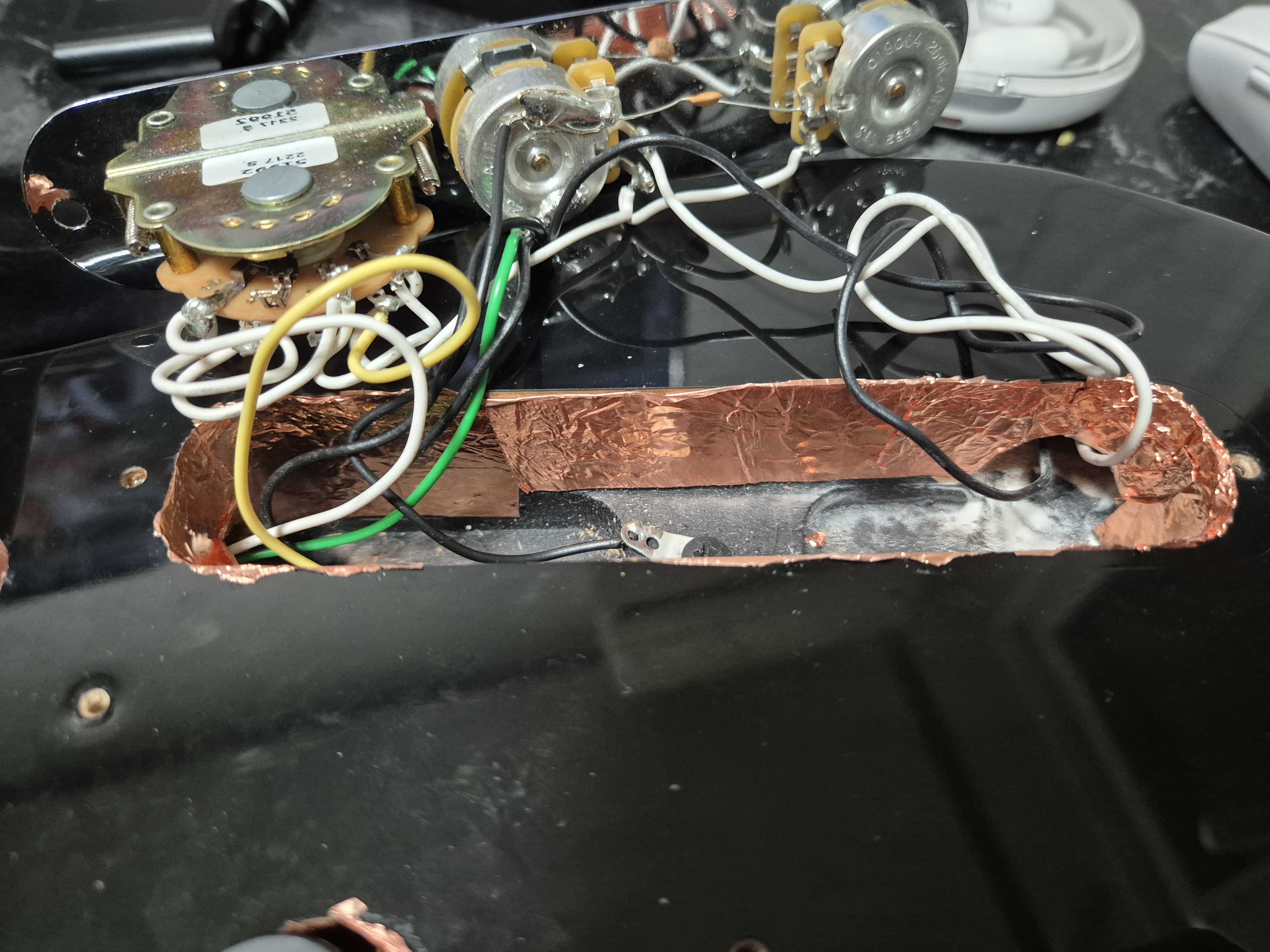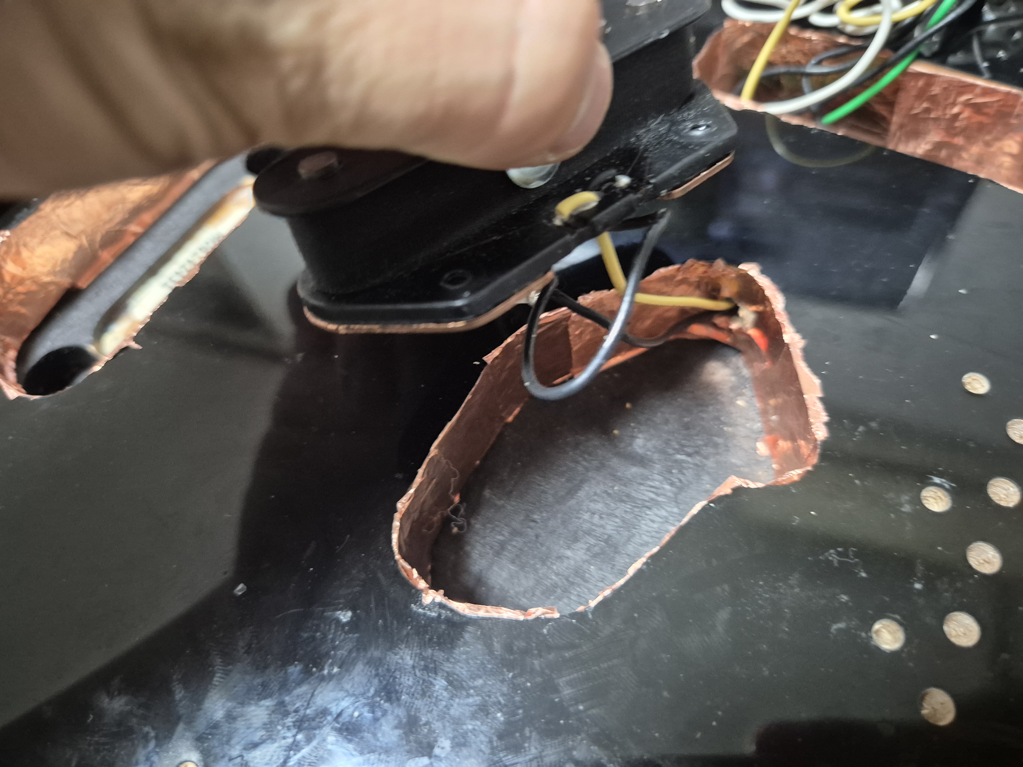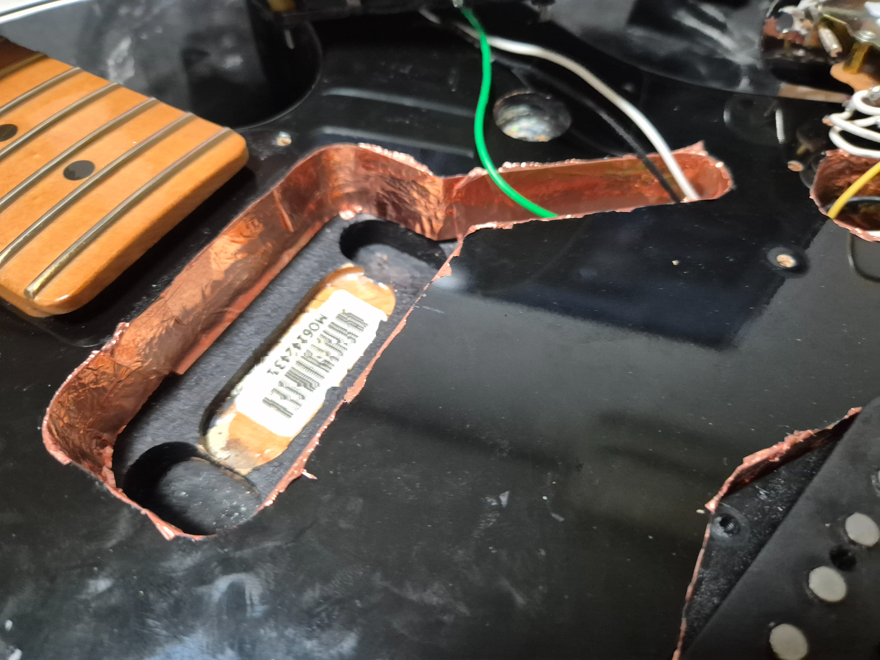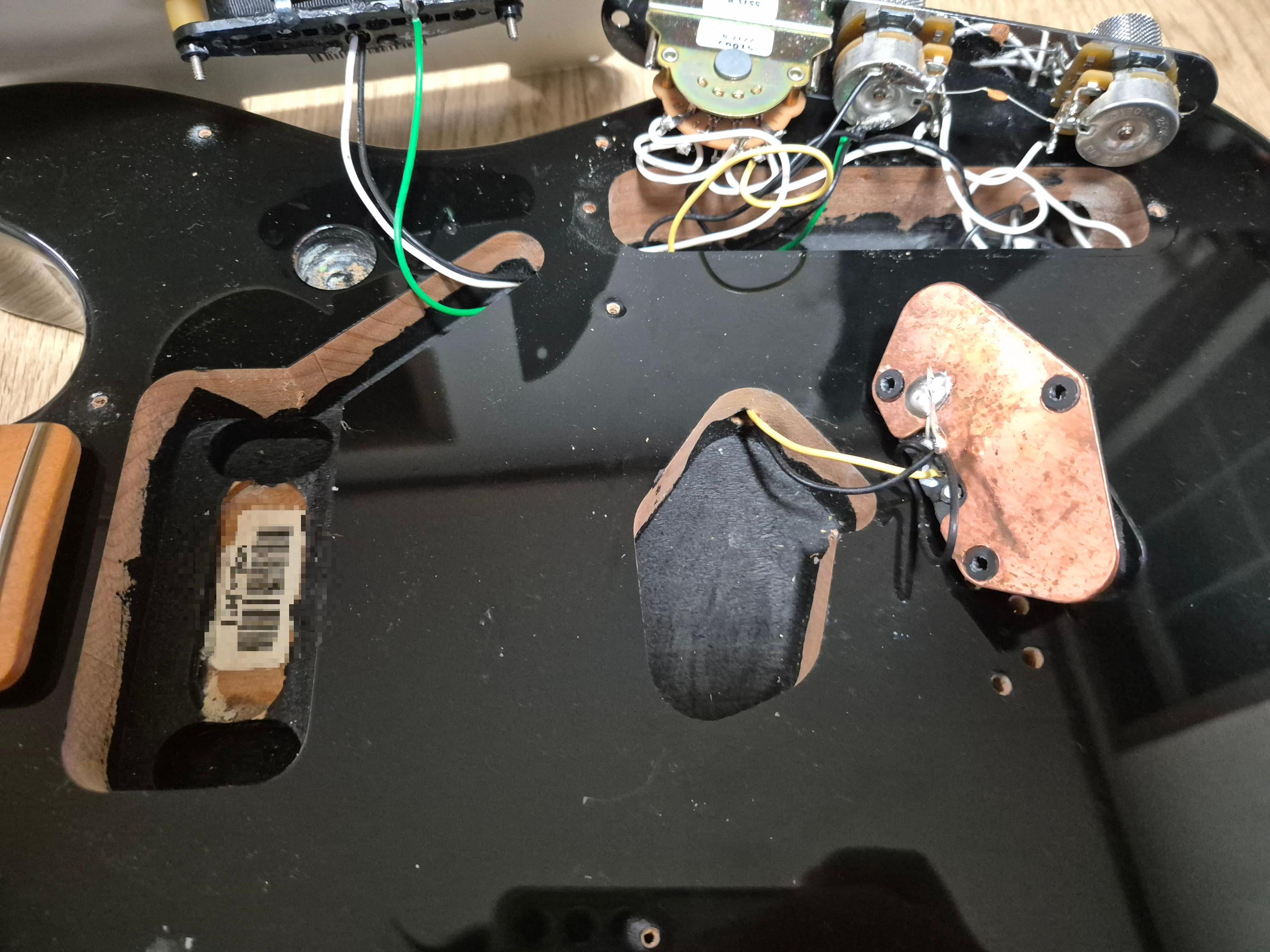 맥펜 플레이어2 텔레캐스터 내부 구조를 보니 아랫면에 흑연도료로 칠한 것을 알 수 있습니다. 이것을 통해서도 쉴딩이 되지만 이왕 작업한 거 험노이즈를 최대한 줄이기 위해 나머지 부분에도 쉴딩을 적용하기로 했습니다. 구리 테이프로 흑연쉴딩이 되어있는 부분에 일부 겹치도록 작업합니다. 각각 둘러서 쉴딩 작업을 진행하면 됩니다. 서로 겹쳐서 접지가 되어야 온전한 효과를 발휘합니다.