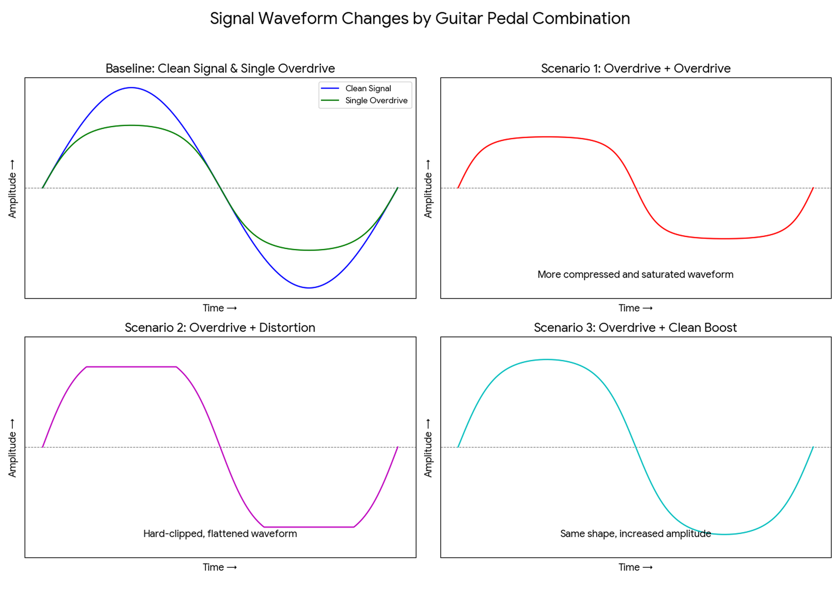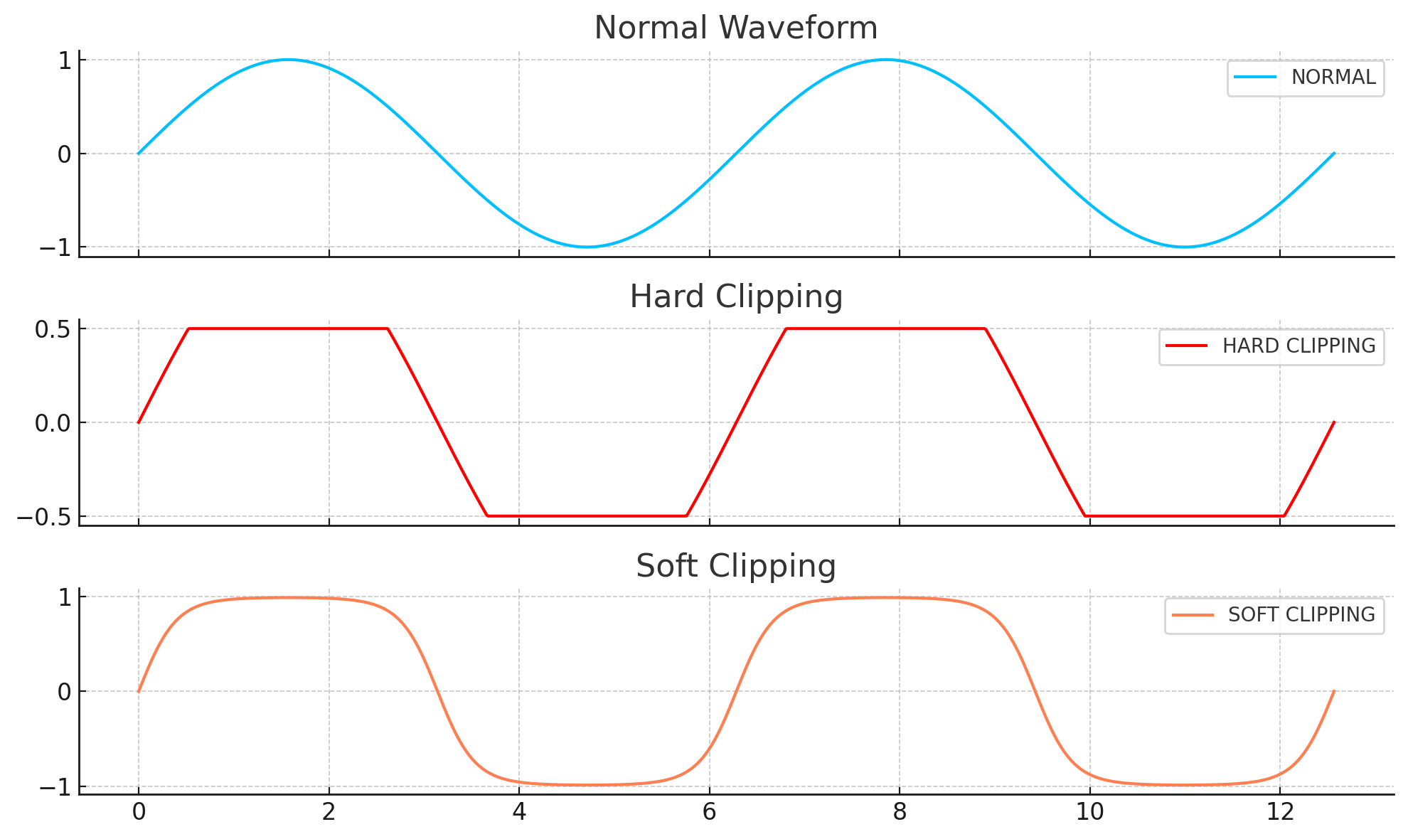 - 하드 클리핑 : 신호를 뚝 자르는 방식으로, 강하고 날카로운 느낌의 왜곡이 생깁니다.