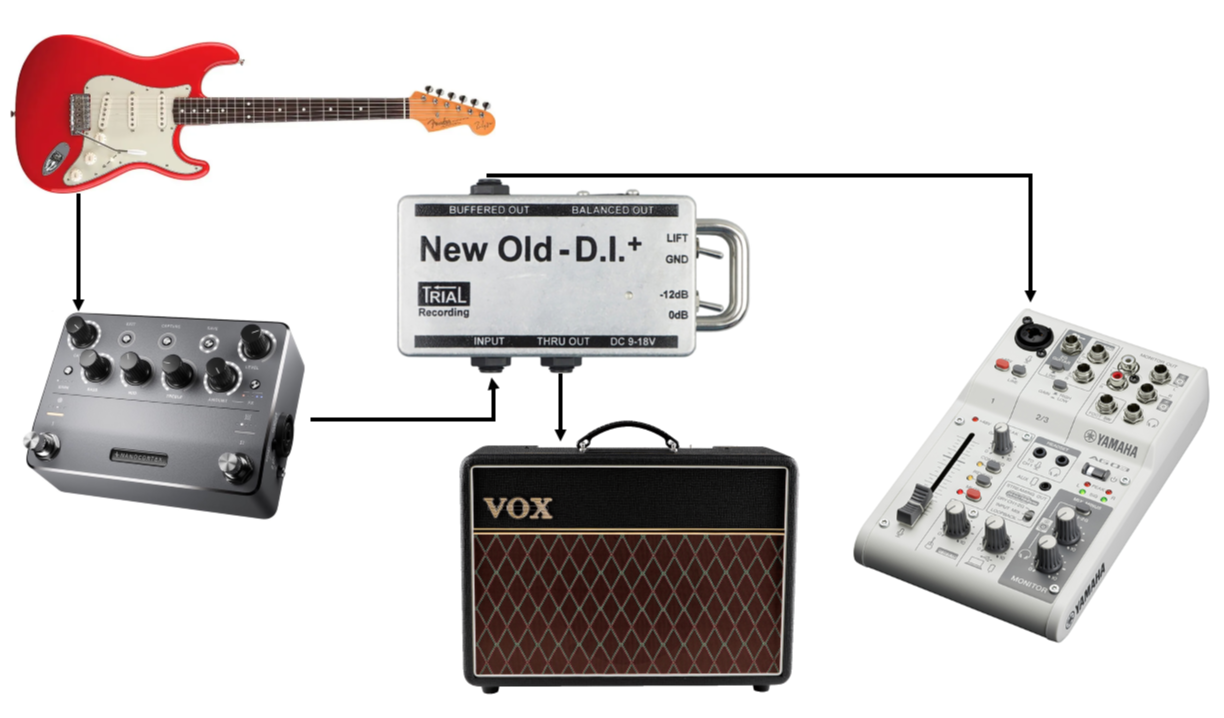 - DI 박스 Output(XLR) → 믹서/오디오 인터페이스 입력
