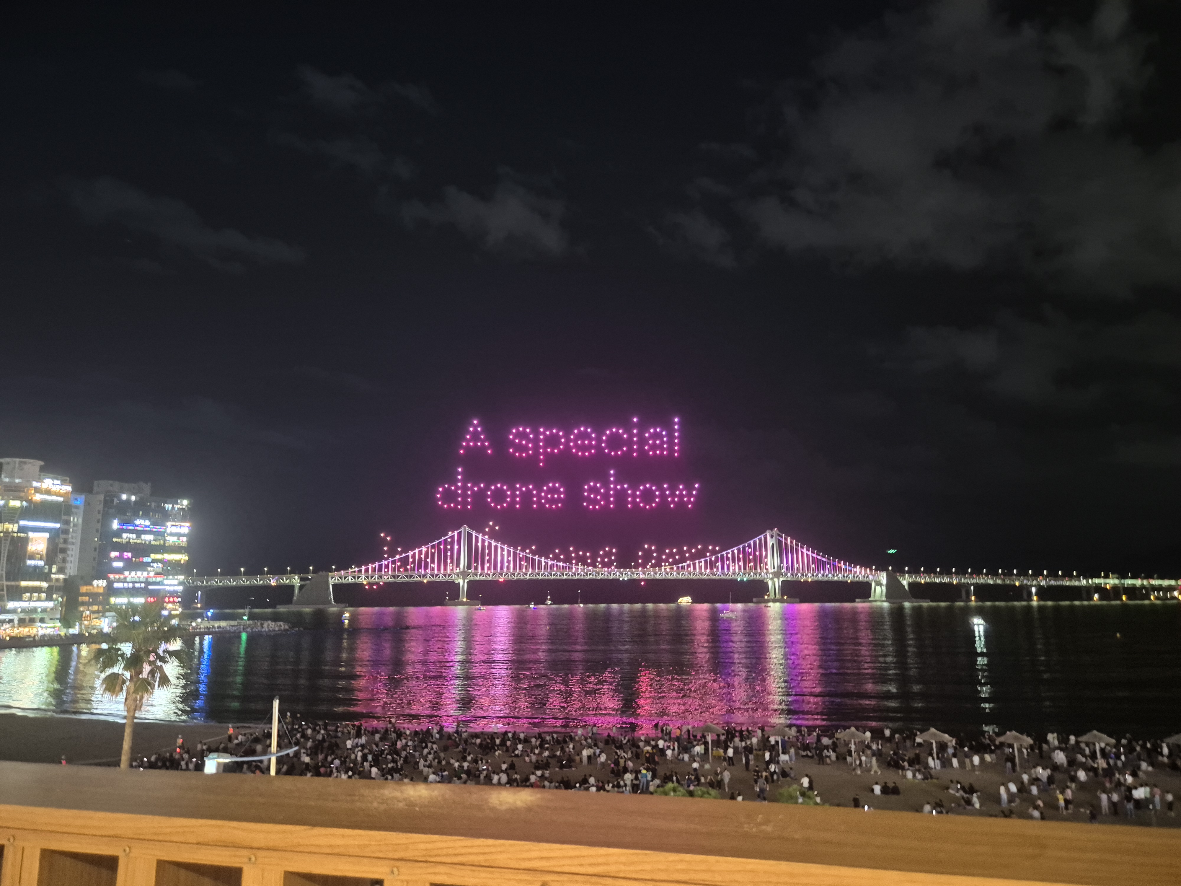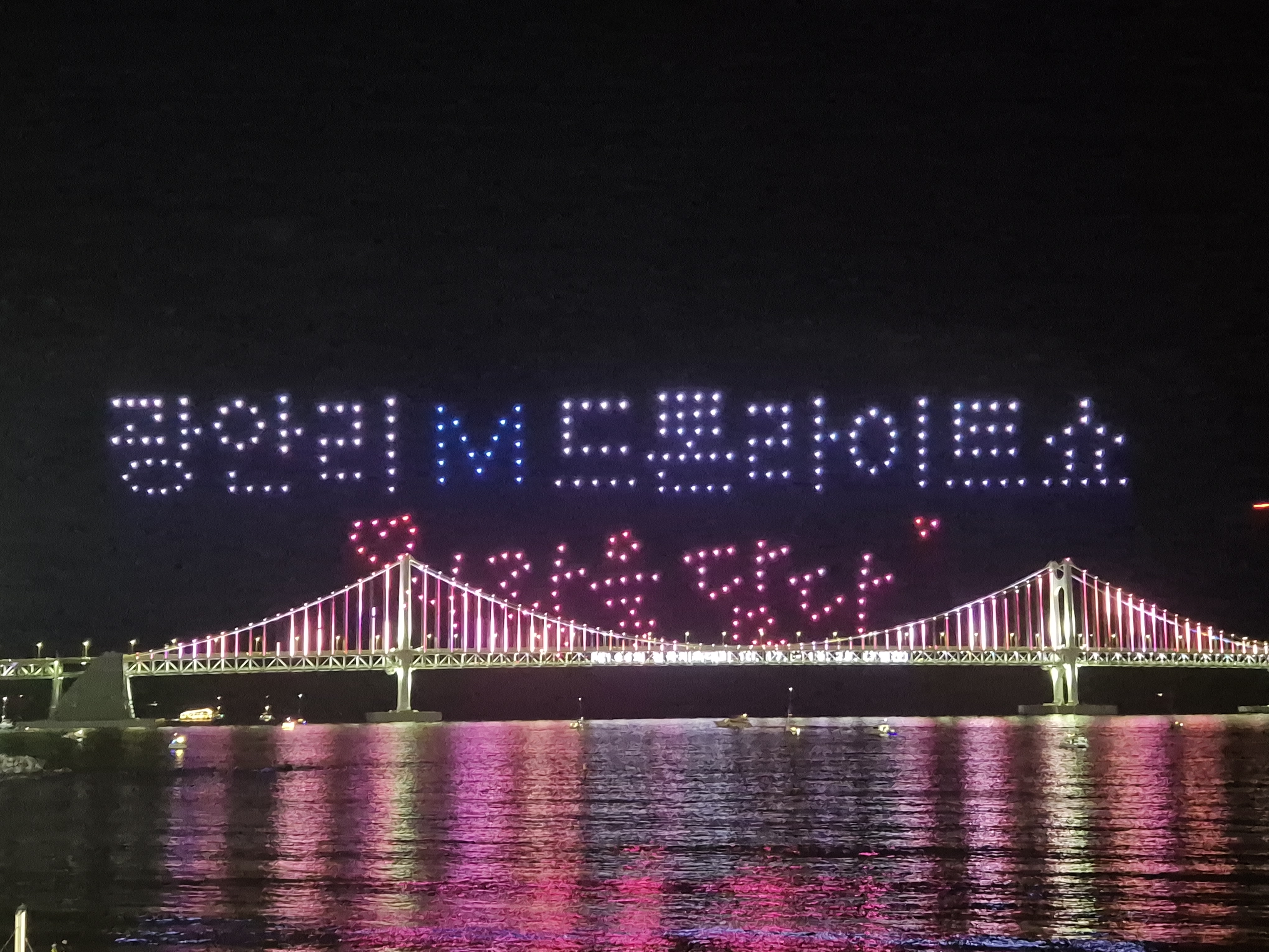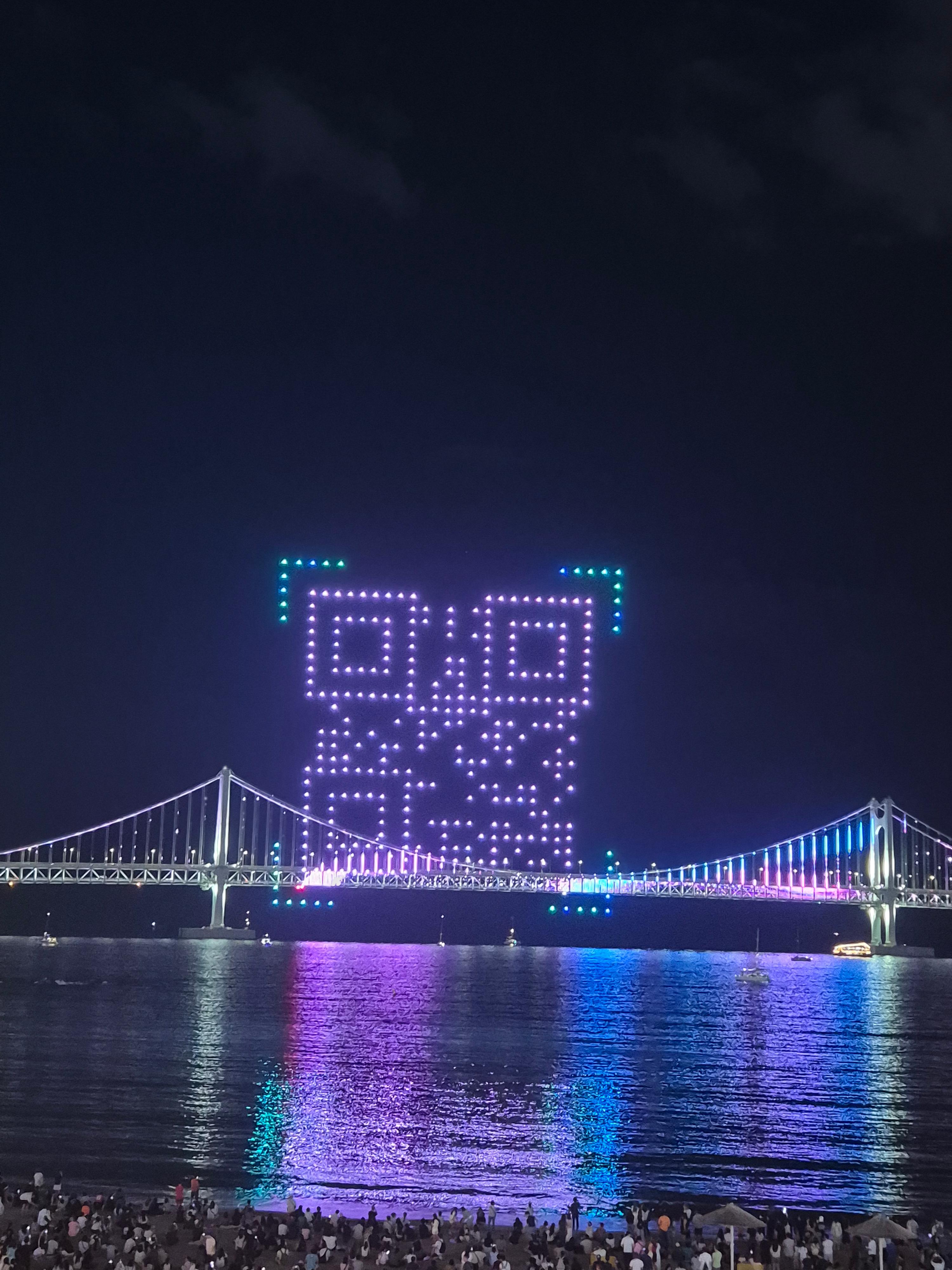 최근에 지인의 결혼식으로 부산을 갔다 왔습니다. 식이 끝나고 광안리 근처 카페 옥상에서 잠시 쉬고 있었는데, 사람들이 하나둘 모이더니 드론 라이트쇼가 시작되었습니다. 뜻밖의 구경거리를 만나서 즐거웠습니다.