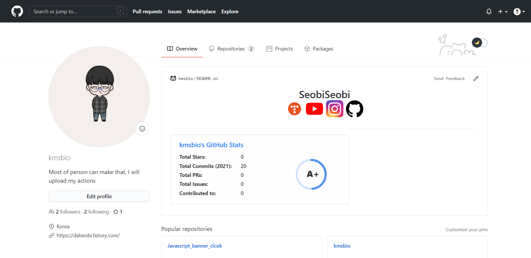 readme.md 이스터에그를 알게 된 것은 지인의 소개로 알았습니다. 이렇게 깃허브 계정을 만들 수 있더라고요. readme.md도 제가 웹호스팅 하는 사이트를 모티브로 제작하였습니다. 제가 사용하는 다른 링크들을 적는 방식으로 이렇게 표현하였습니다. 여기에 제 깃허브 통계를 추가한 모습입니다. (Simple is best)