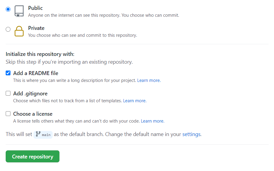 어차피 사용하는 것이기 때문에 Add a README file은 체크하도록 하겠습니다. 이제 만들어 보도록 하겠습니다.