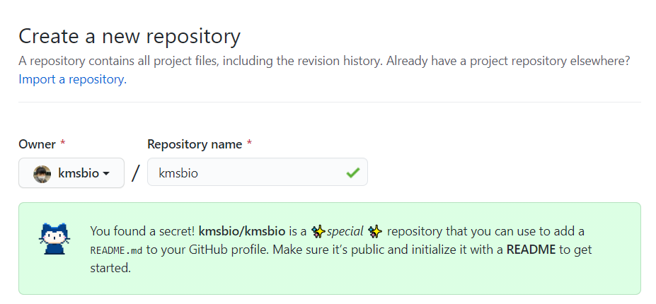 repo의 이름에 자신의 아이디와 똑같이 적으면 귀여운 고양이가 깃허브 프로필에 쓸 수 있다고 이야기합니다.