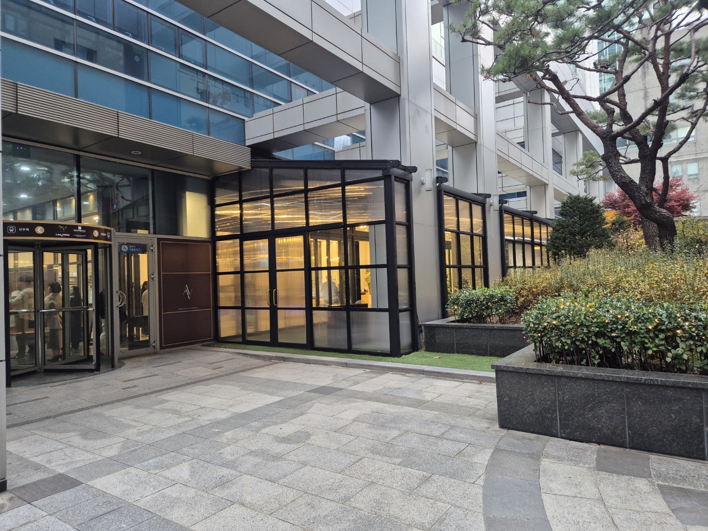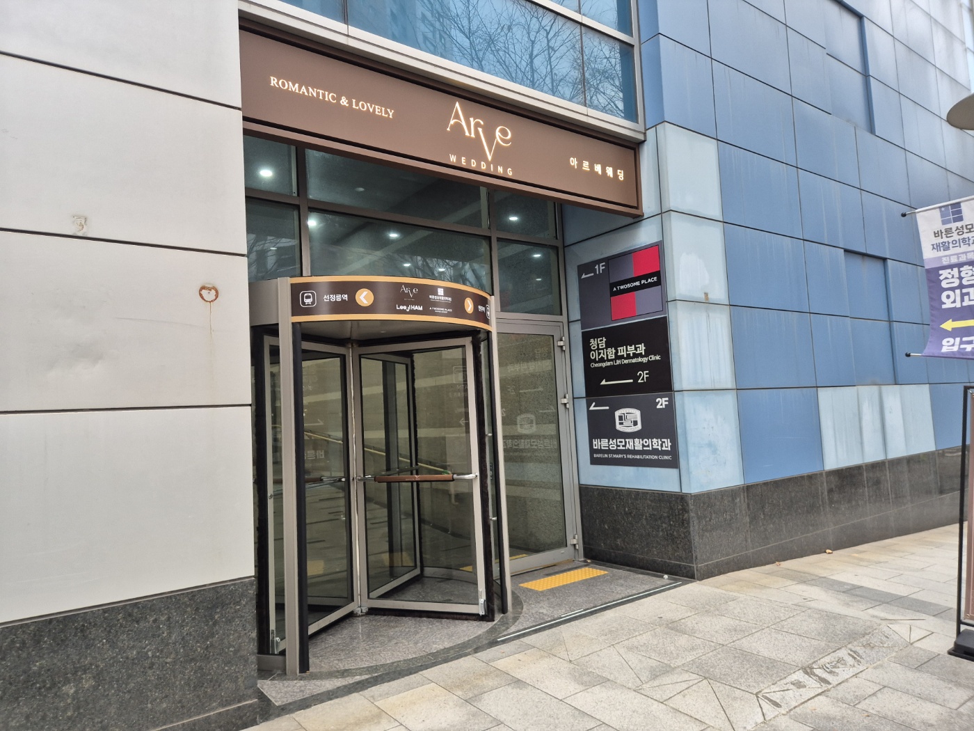 일단 예식장은 크게 두 가지 방향으로 들어갈 수 있습니다. 1층의 반을 사용하는 구조입니다.