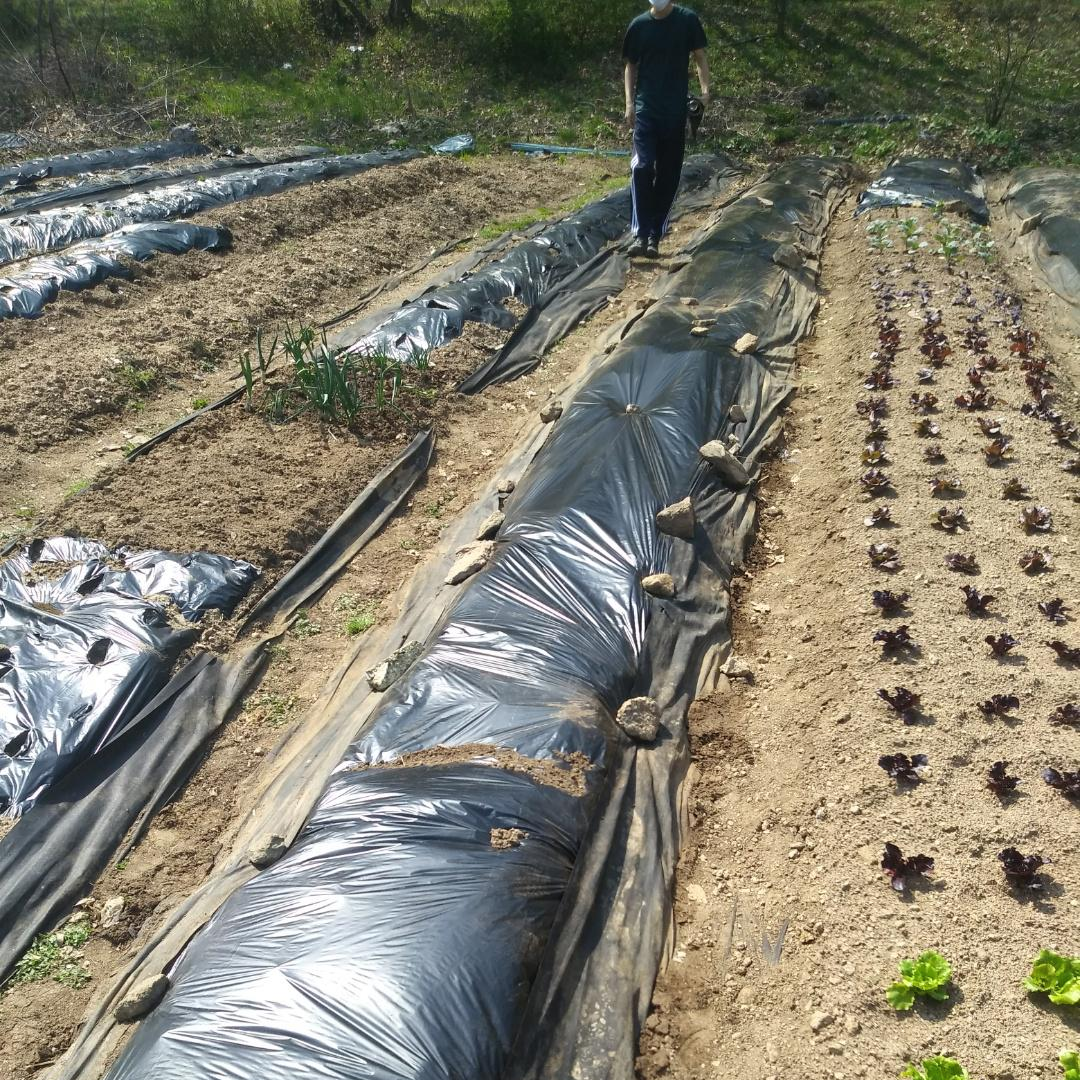 - 퇴비를 섞은 뒤 땅 전체를 비닐로 덮는다.