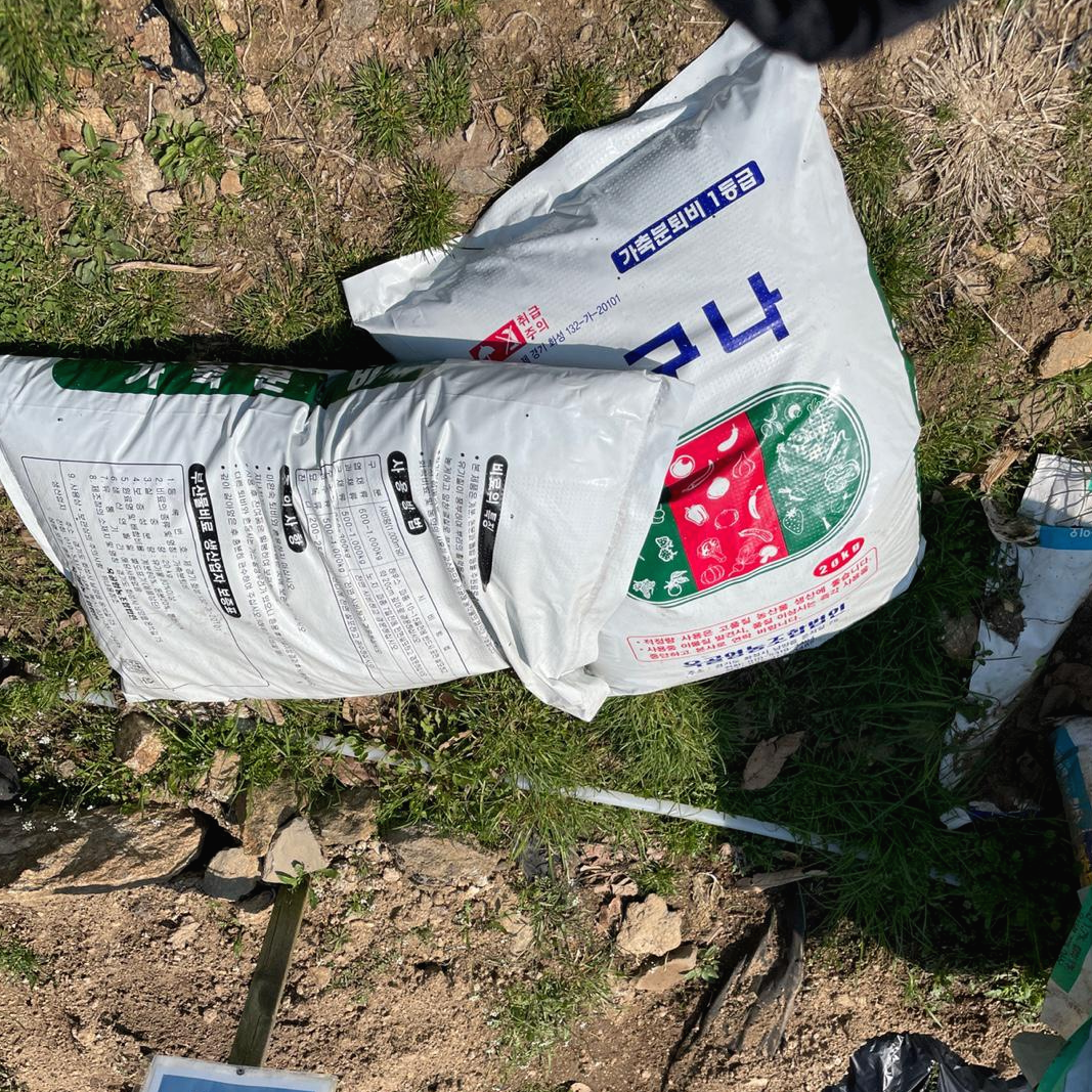 밭 평탄화 공사를 마친 뒤 퇴비를 뿌려주었습니다. 20kg 퇴비 두 개를 5평으로 각각 뿌렸습니다. 그리고 다시 퇴비를 삽질로 섞었습니다. 퇴비는 한 번에 많이 뿌려버리면 삼투압 현상으로 식물이 시들게 됩니다. 그래서 퇴비를 고르게 정렬하였습니다.