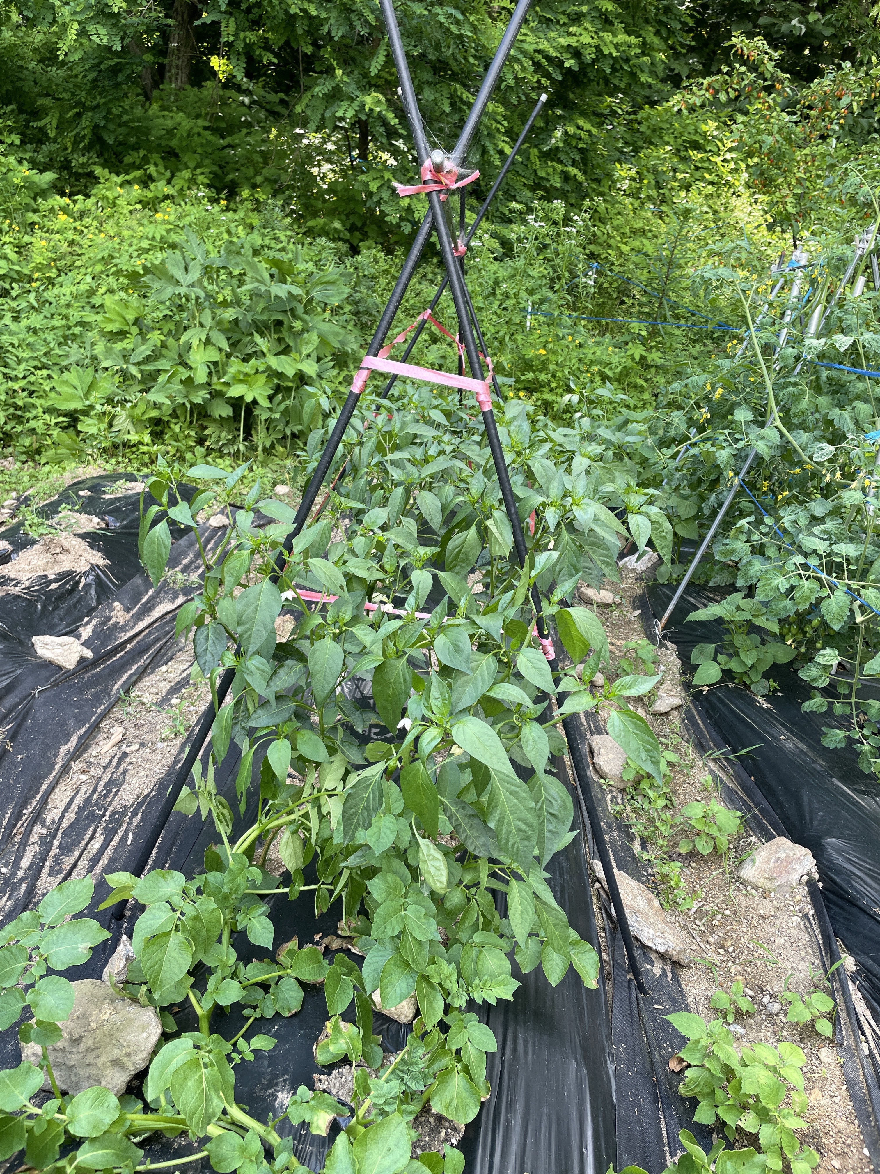 고추는 자라고 있는데 아직 덜자라서 장마가 끝나 빨간 고추가 되면 그때 수확하려고 준비 중입니다.