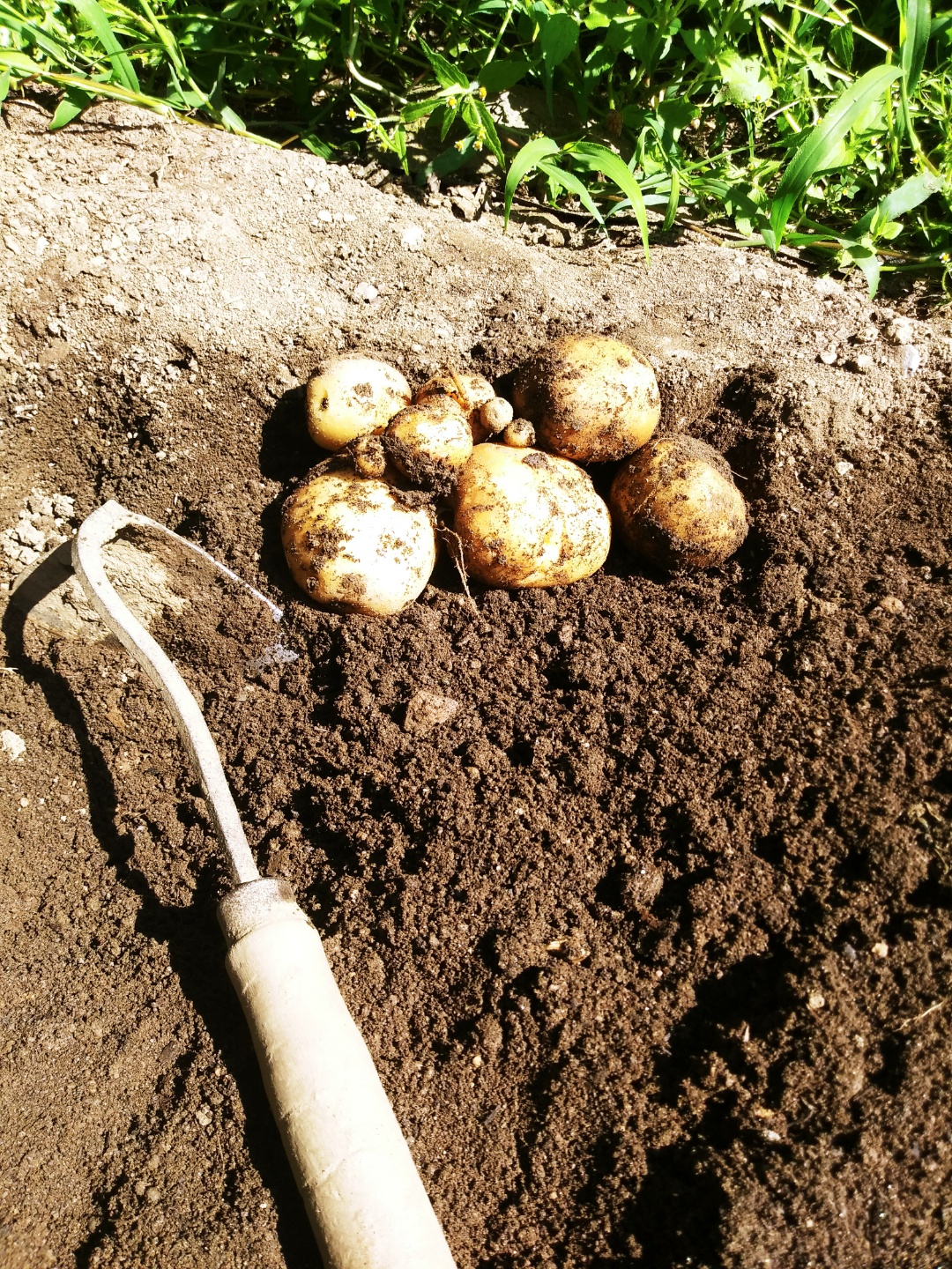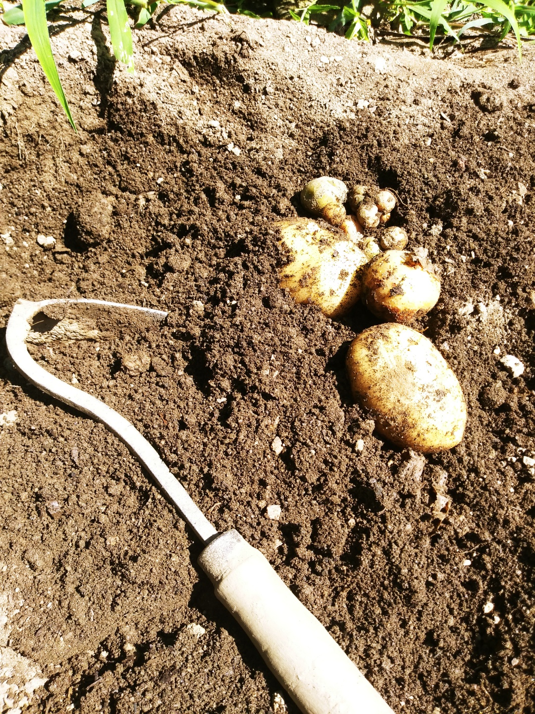 - 호미로 감자가 상처 안 나게 흙을 걷어냅니다