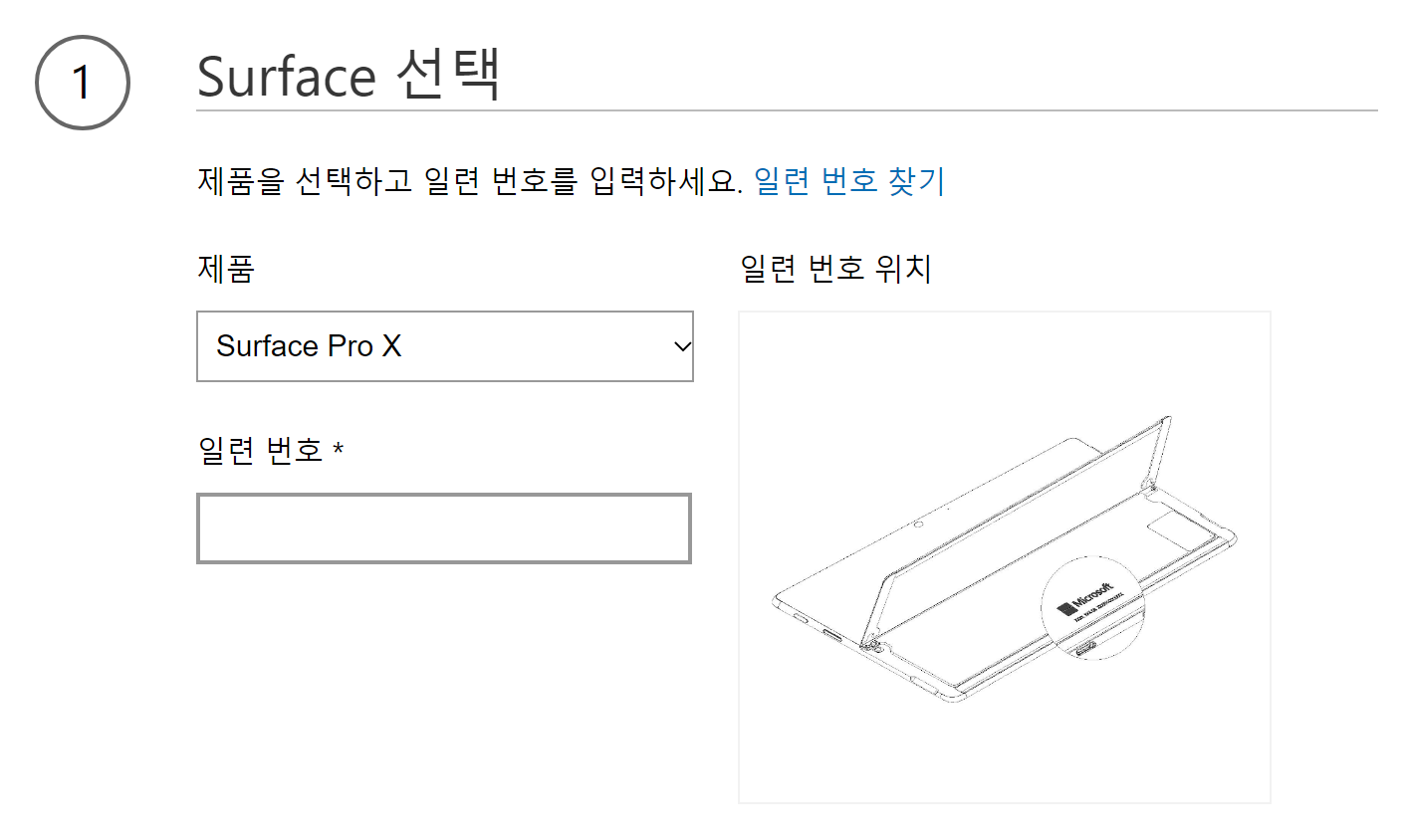 2. 여기서 서피스프로 제품을 찾고 일련번호를 치고 계속 버튼을 눌러줍니다.