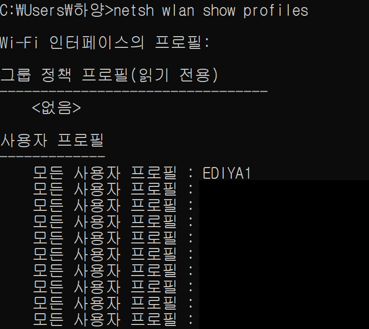 해당 명령어를 입력하면 위의 사진과 같이 화면이 나옵니다. 제가 가려서 하나만 있고 실제로는 그동안 자신이 사용했던 프로필이 다나옵니다. 대상이 되었던 와이파이를 찾으면 다음 단계로 넘어갑니다.
