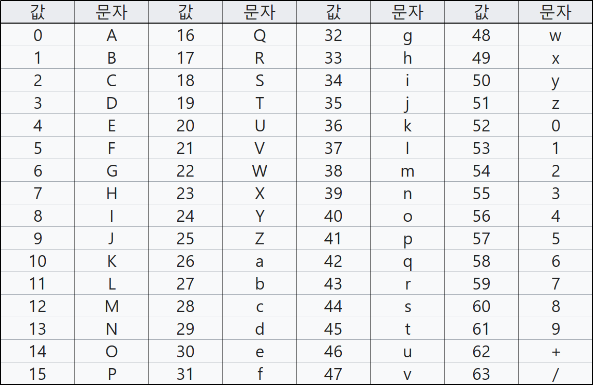 Base64코드는 64개의 문자로만 이루어진 문자 코드입니다. 우리가 일반적으로 사용하는 ASCII 코드는 128가지의 문자로 이루어져 있습니다. 따라서 매칭하여 문자열로 변환할 수 있습니다. 여기서 ASCII 코드를 사용하지 않은 이유는 문자만 이루어져 있지 않기 때문입니다. 문자열로만 전송하는 경우에는 상관이 없으나 인코딩하여 전송하는 경우에 오류가 날 수 있습니다. 안정적으로 인코딩을할 때 사용하기 위하여 해당 문자 코드가 사용됩니다.